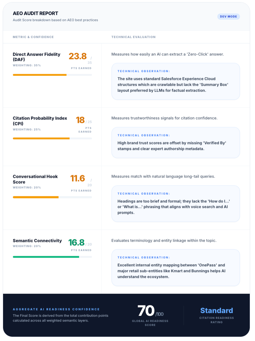 I've learnt a lot about AEO through building the auditing criteria for this tool, a new terminology beyond tradition SEO terms during the research on industry expert websites plus using answer engines as well was a great experience. It was truly amazing the speed we can do a deep research on any subject in this AI era.