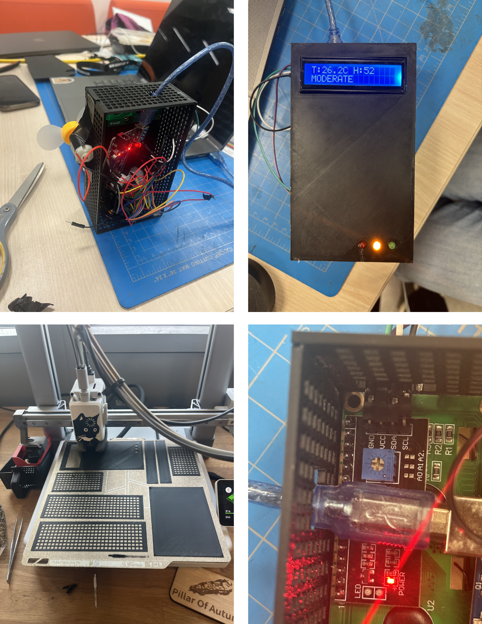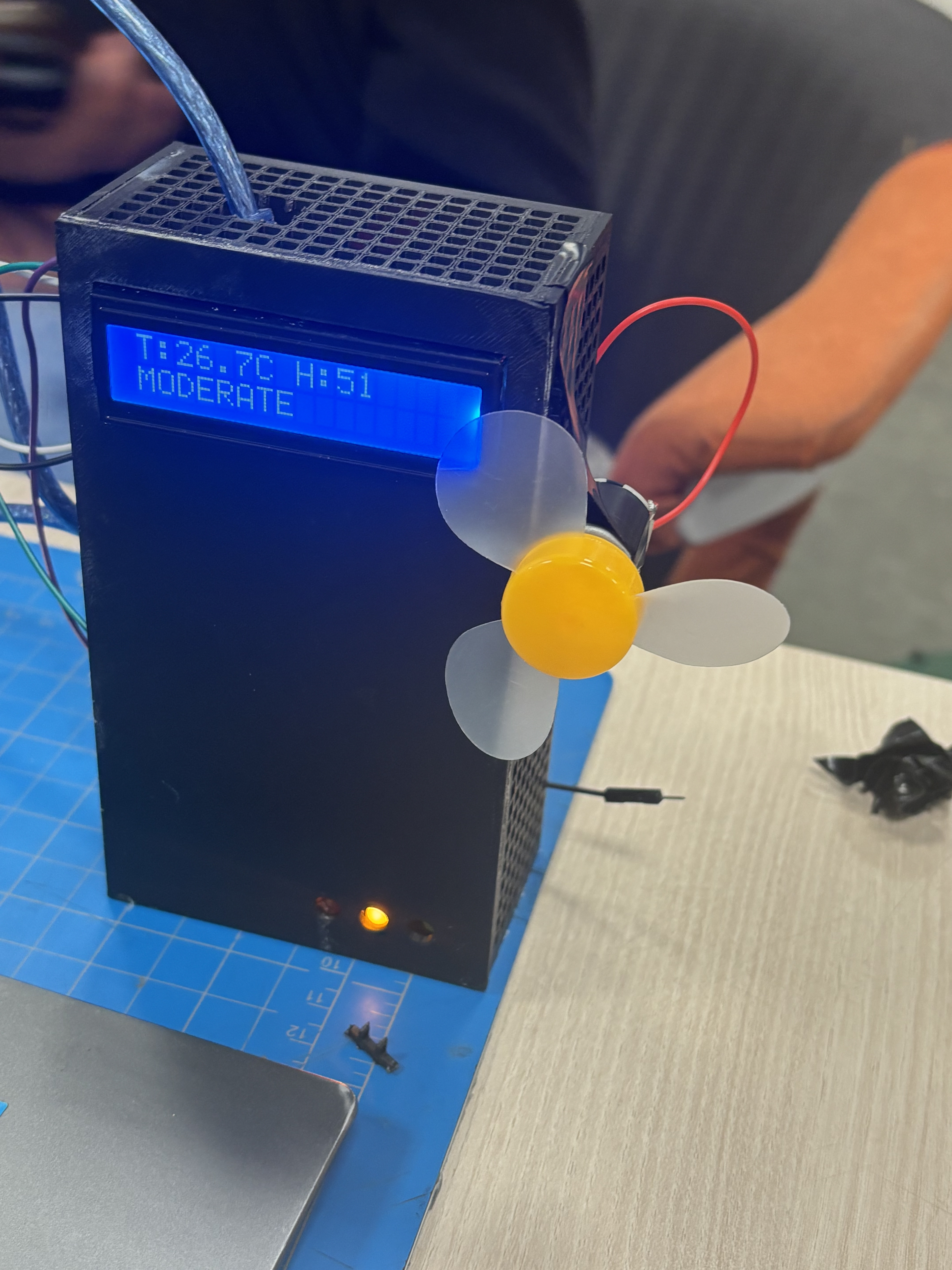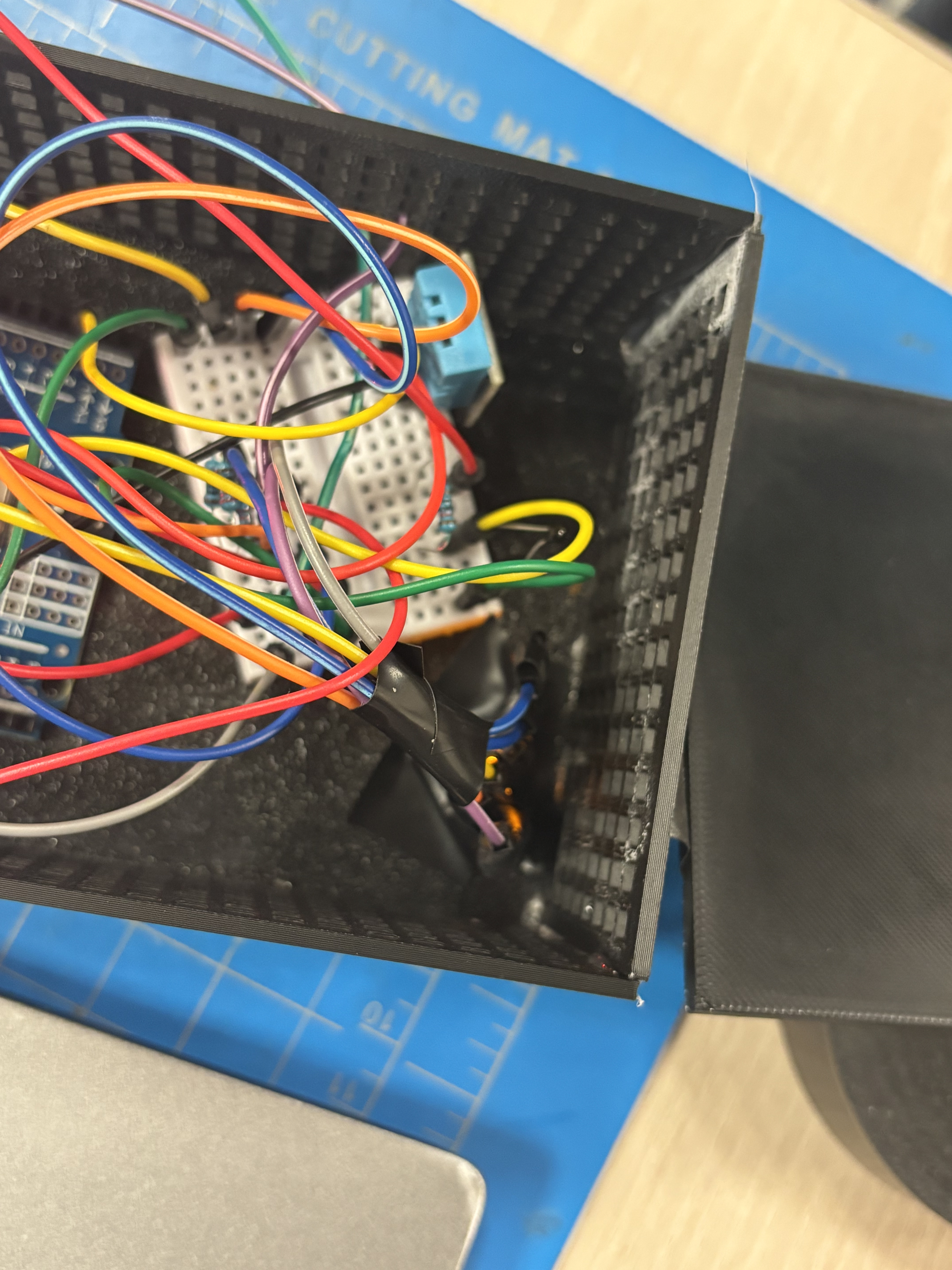 We started by measuring the dimensions of the given hardware kit, which includes an Arduino Uno Q, a battery, wires, colored LEDs, and a temperature and humidity module. We 3D printed a box with many airways in the side panels to allow accurate sensor readings. The back has a sliding mechanism for easy installation and removal if it were to be set on a wall. Each panel was printed separately and glued together. We used AI to help create the code.