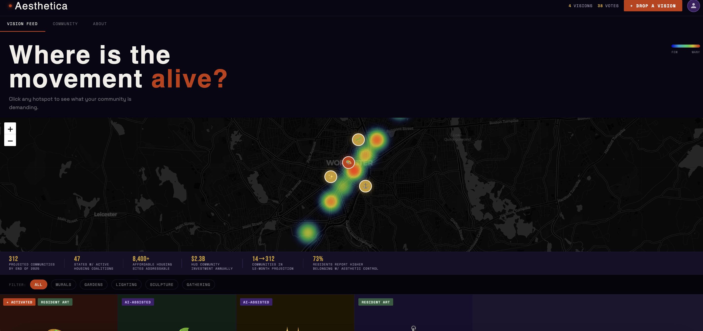 Aesthetica's live community heatmap, showing aesthetic justice movement activity across the US, with Worcester, MA as the origin point.