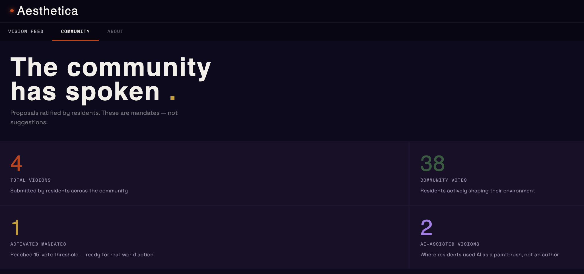 Live community data -- 4 visions, 38 votes, 1 activated mandate. Every number is a resident who showed up.