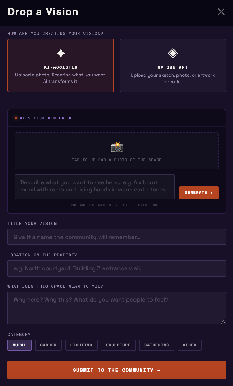 Residents choose: AI-assisted or their own art. Describe the space, drop the vision, submit to the community. You are the author.