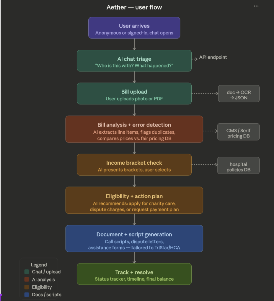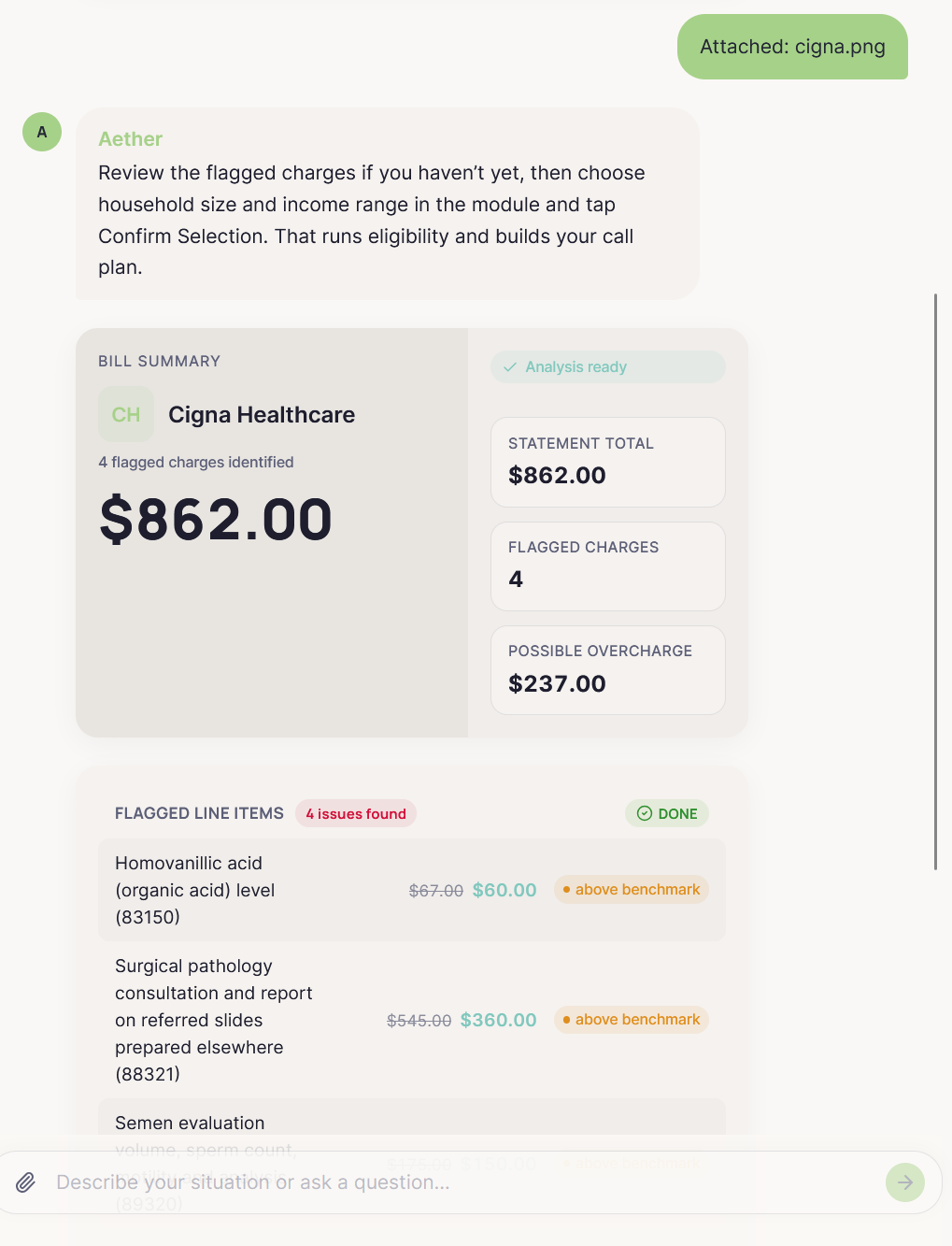 Aether is an AI-assisted medical bill advocate focused on helping patients understand, challenge, and resolve hospital bills with clear next actions.