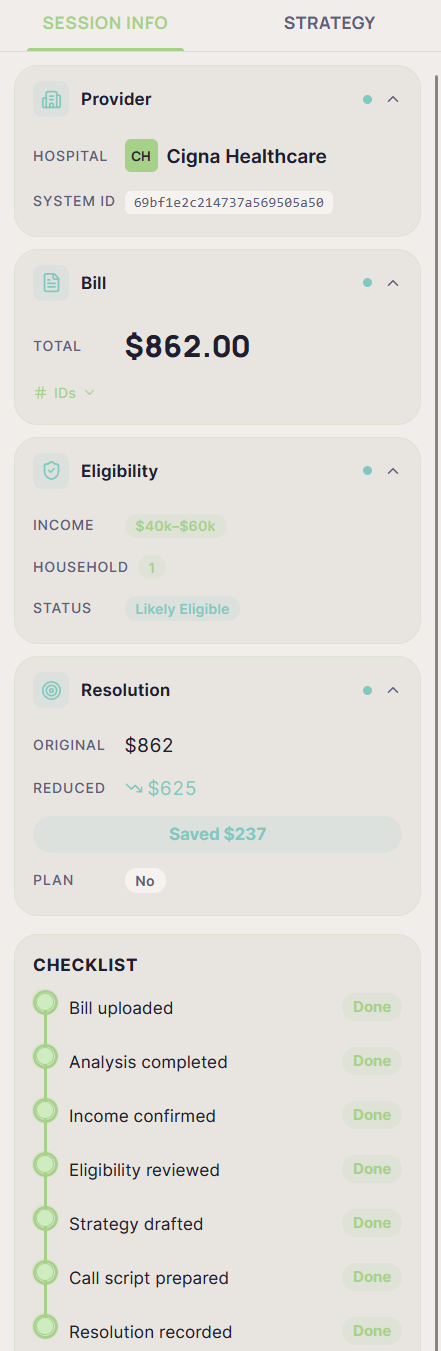 app/apifor sessions, chat, uploads, analysis, assistance, strategy, hospitals, and resolutions. - Orchestrator-driven state machine that advances session steps deterministically. This guarantees the workflow cannot skip critical steps—like income verification—before generating a strategy.