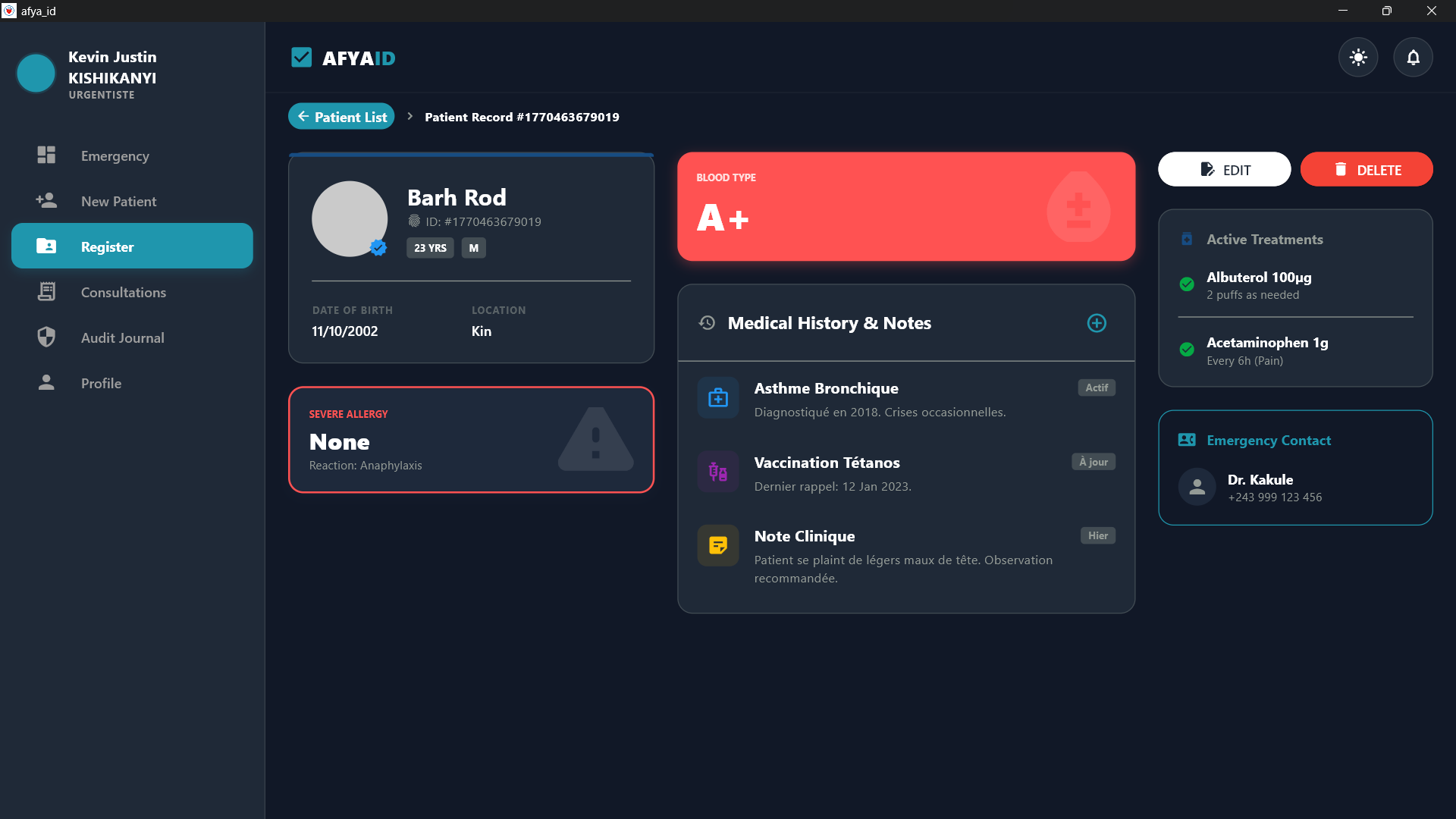 This application allows healthcare workers to identify a patient using facial recognition, fingerprint scanning or just typing his name if he has his ID and instantly display vital medical data, even offline.