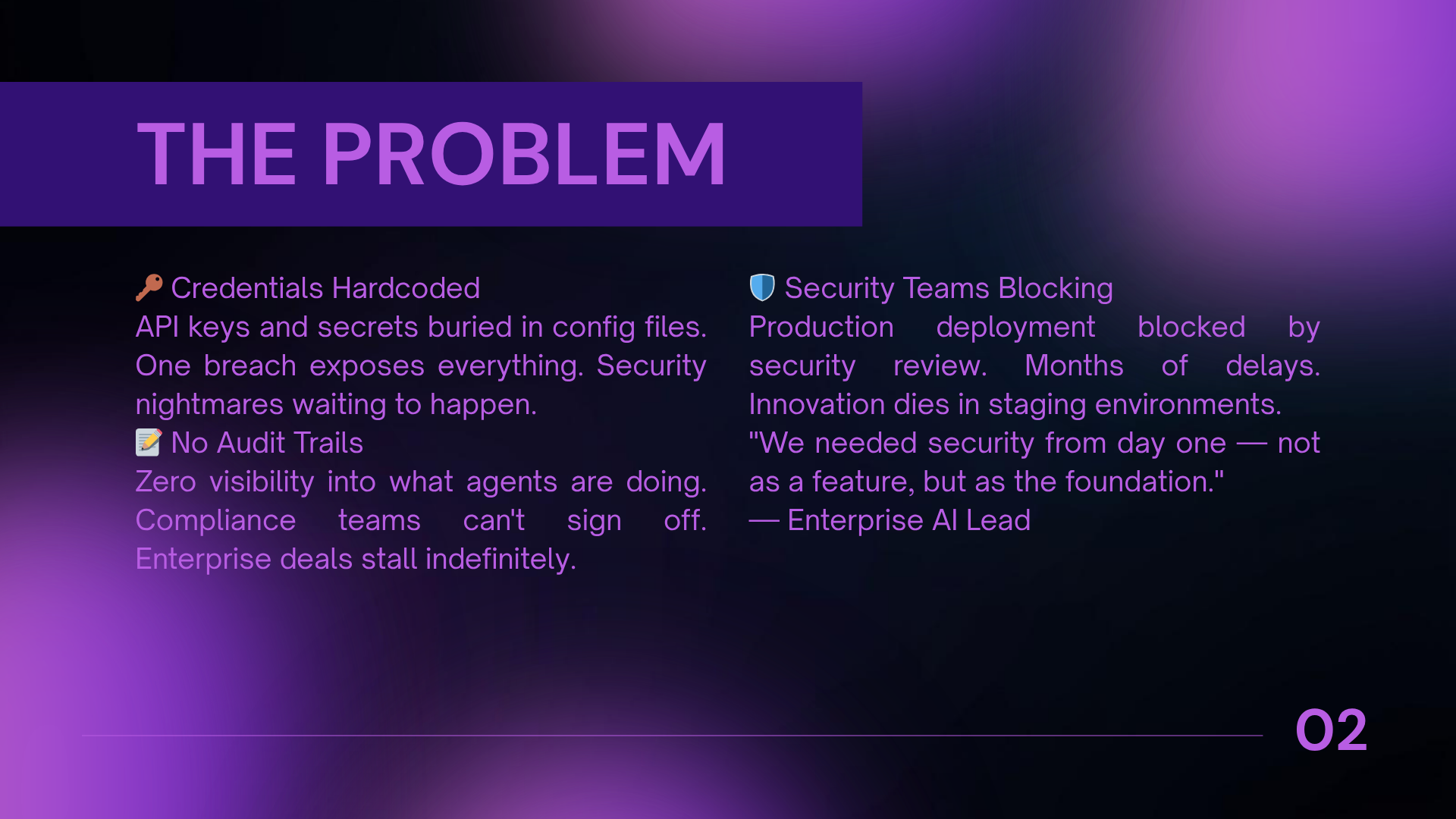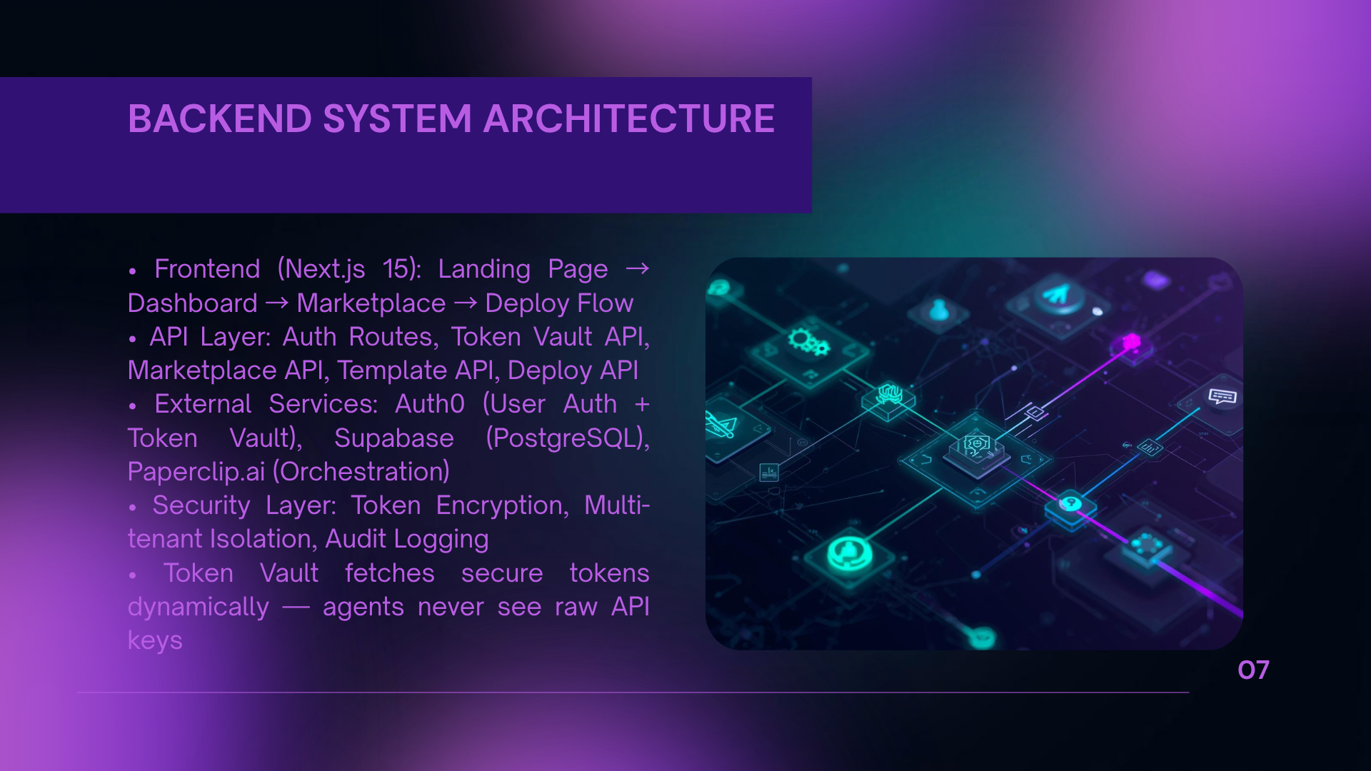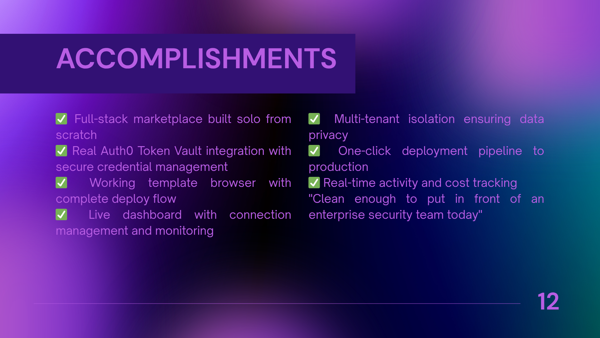 - Deployment: Vercel Challenges Auth0 Token Vault required learning a completely new mental model for non-human identity — scoped credential issuance for agents mid-task is very different from standard user auth. Wiring multi-tenant isolation so each user's agents only access their own vault space took real debugging under time pressure. Accomplishments Shipped a working, full-stack AI agent marketplace — solo — with real Auth0 Token Vault integration, a functional template browser, one-click deploy flow, and a live dashboard. The security architecture is clean enough to present to an enterprise security team today. What We Learned Auth0 Token Vault is an underutilized primitive that the industry hasn't caught up to yet. Non-human identity is the missing layer of the agentic stack — and the teams that own that layer will own enterprise AI deployment for the next decade. What's Next
