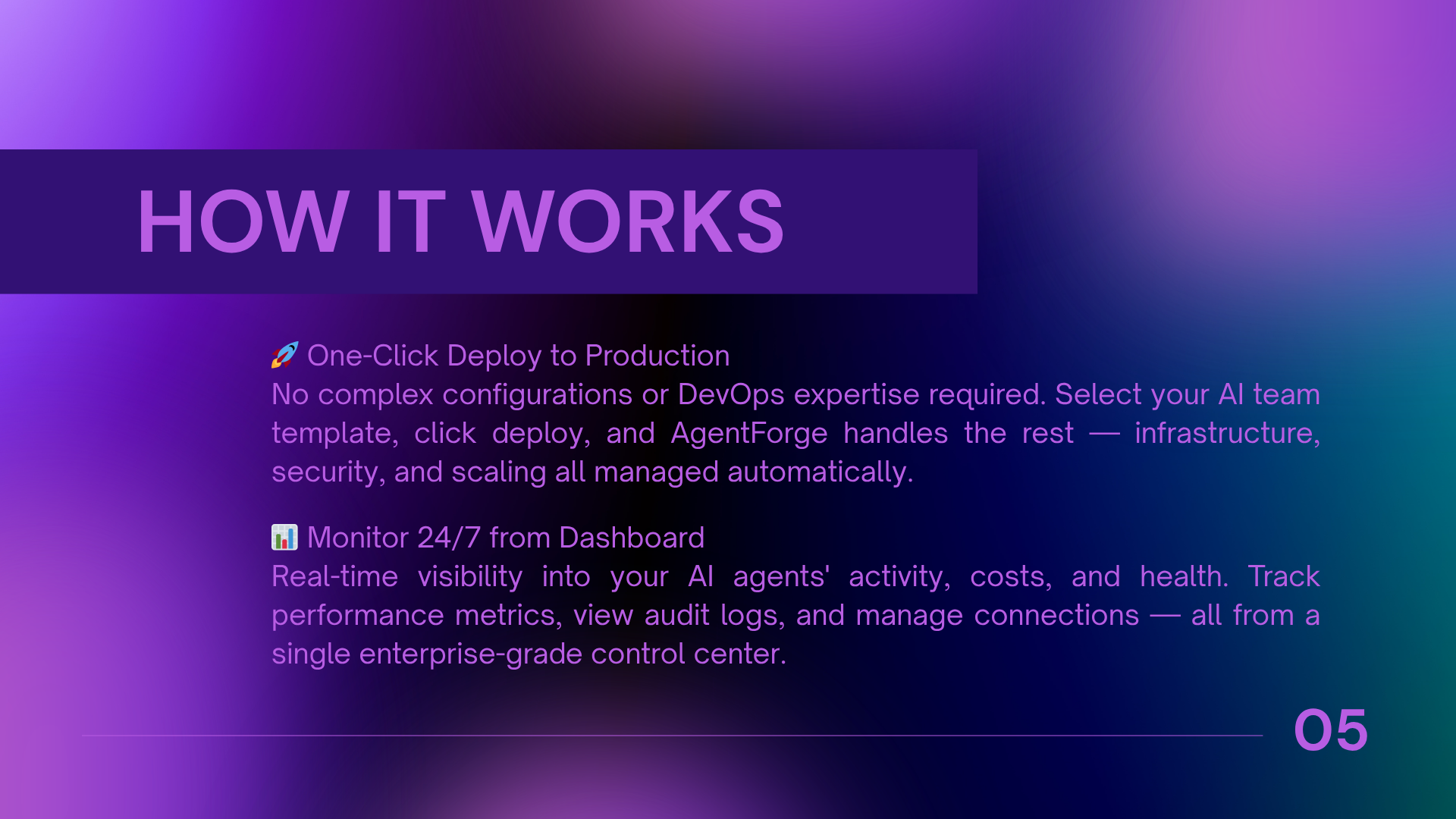 About AgentForge Inspiration Every enterprise piloting AI agents hits the same wall: credentials hardcoded in config files, no audit trails, security teams blocking deployment. I wanted to build the infrastructure that makes agent deployment safe by default — an app store where you don't just browse agents, you deploy them with enterprise-grade security baked in from day one. What It Does AgentForge is an app store for AI agent teams. Users browse pre-built agent companies — CEO, CTO, Engineers — purchase a template, and deploy a fully autonomous team in one click. Under the hood, Auth0 Token Vault handles all credential management: agents access external APIs like Stripe and GitHub without ever touching raw keys. Every action is scoped, logged, and revocable. How We Built It Solo build using: