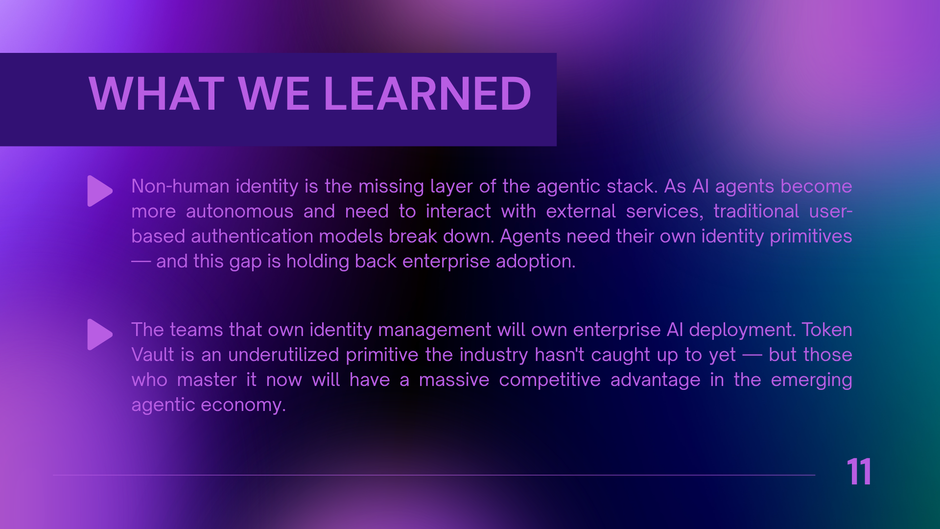 - v2.0: Team collaboration, custom agent roles, advanced analytics, multi-cloud deployment The long game: making AgentForge the default distribution and security layer for the B2A (Business-to-Agent) economy. --- Blog Post Building the Future of AI Hiring: Our Token Vault Journey When we sat down to build AgentForge — an app store where anyone can hire AI agent teams — we had grand ambitions but one sleepless worry: security. We were essentially building a platform where autonomous digital workers would need access to users' Stripe accounts, GitHub repositories, email services. Handing AI agents API keys felt like handing a new intern the master password to everything. The Wake-Up Call Our first architecture was naive. We stored API keys in environment variables, reasoned we'd "rotate them later." Then we tried to explain this to a potential enterprise user. The look on their face said it all: "You want my production Stripe keys living in your system?" That meeting ended fast. We knew we needed enterprise-grade security from day one — not as a future feature, but as the foundation. Discovering Token Vault Auth0's Token Vault wasn't in our original tech stack. We stumbled onto it while researching secure credential management for AI agents. The concept was elegant: instead of agents holding keys, they request them dynamically from a secure vault. Each agent gets exactly the permissions it needs — nothing more. No keys scattered in code. No database of secrets. Just clean, auditable access. The Three-Day Wall Integration took longer than expected: