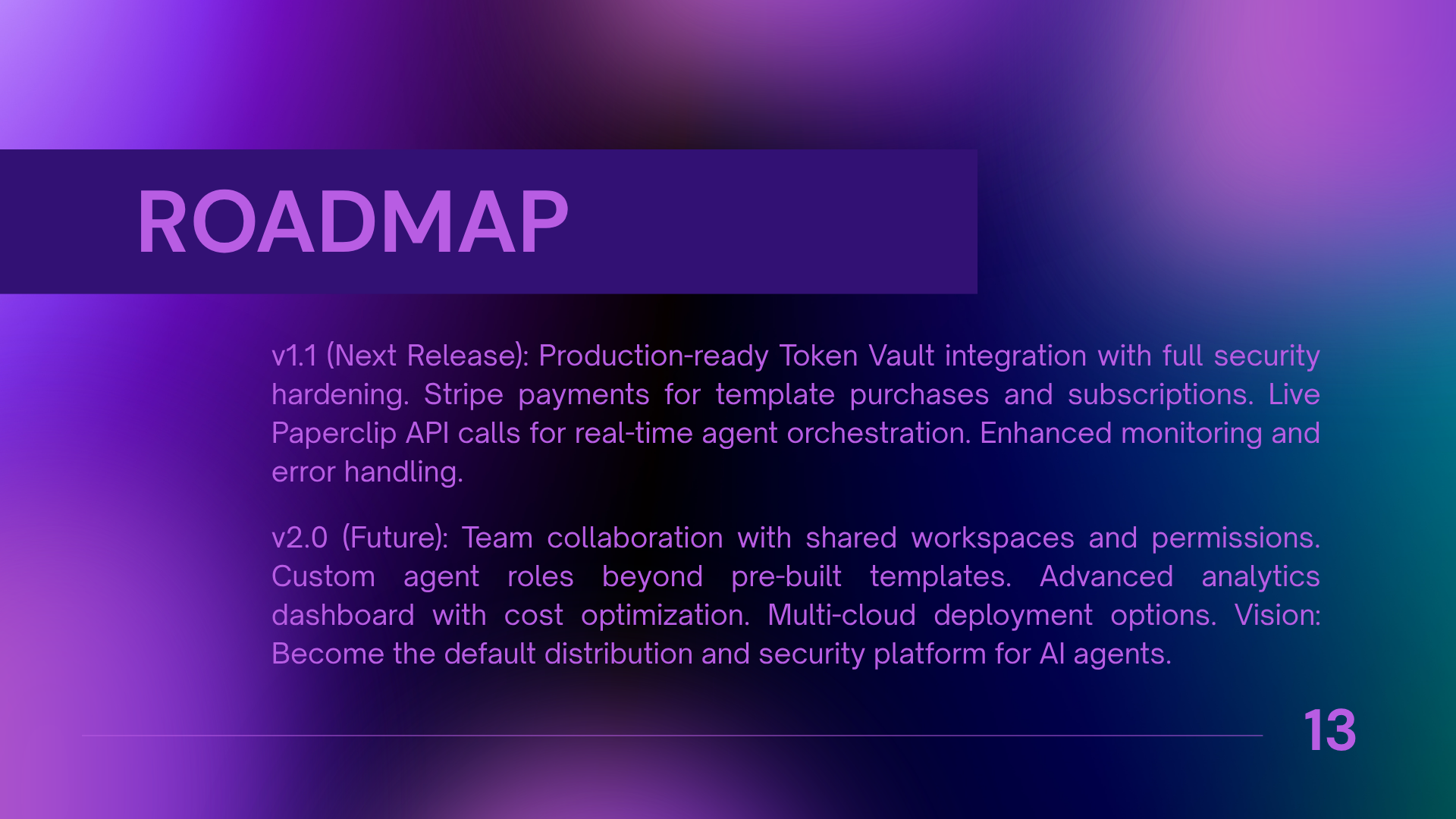- v1.1: Production Token Vault integration, Stripe payments, live Paperclip API calls