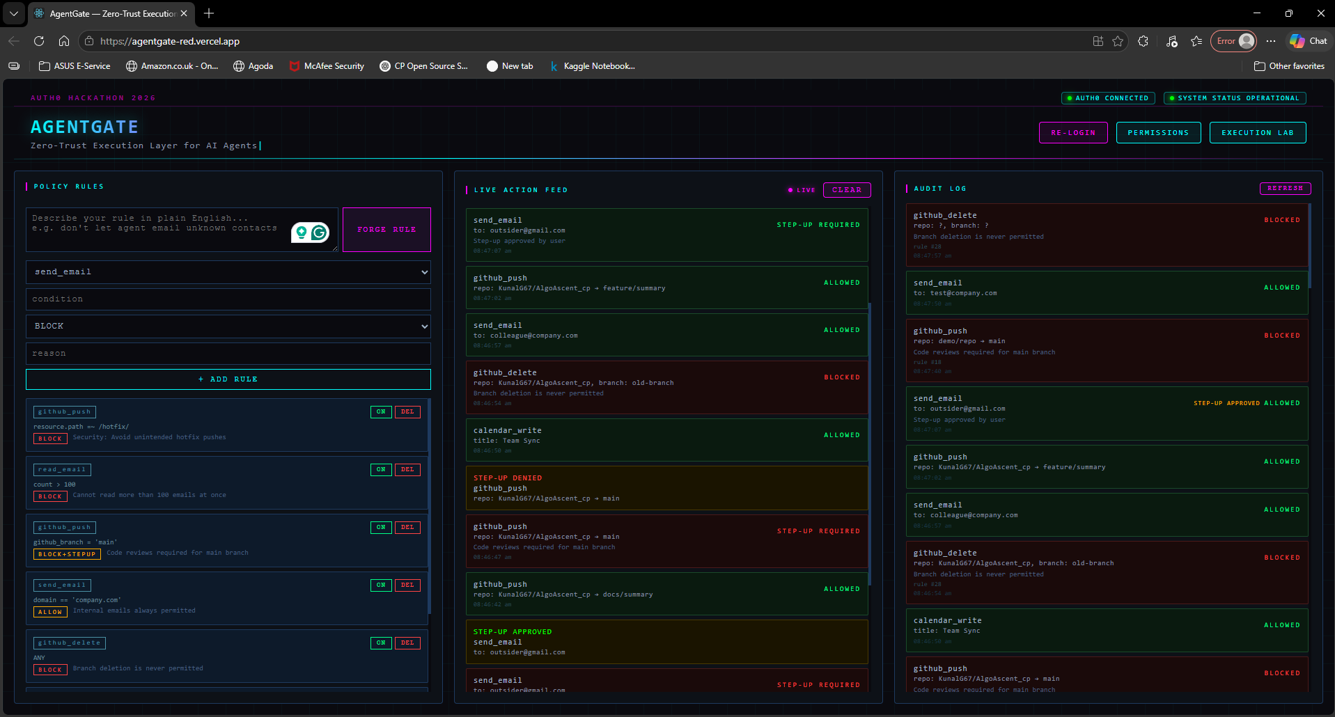 AgentGate is a zero-trust proxy layer for AI agents. Instead of letting agents call Gmail, GitHub, or any API directly, every action passes through AgentGate first. The policy engine evaluates it and returns one of three outcomes: ALLOWED (executes immediately), BLOCKED (rejected with a reason), or STEP-UP (held for human approval via a real-time dashboard).