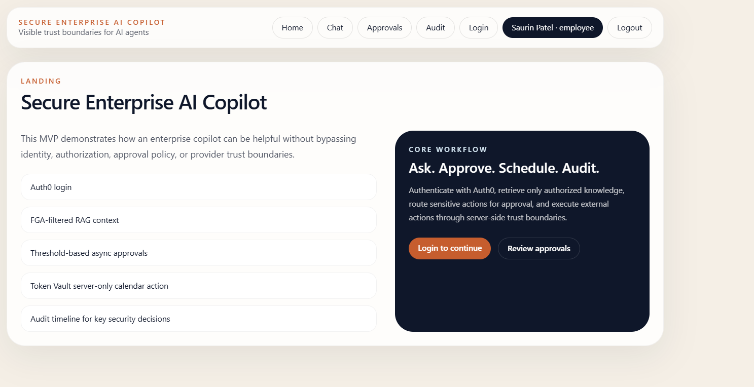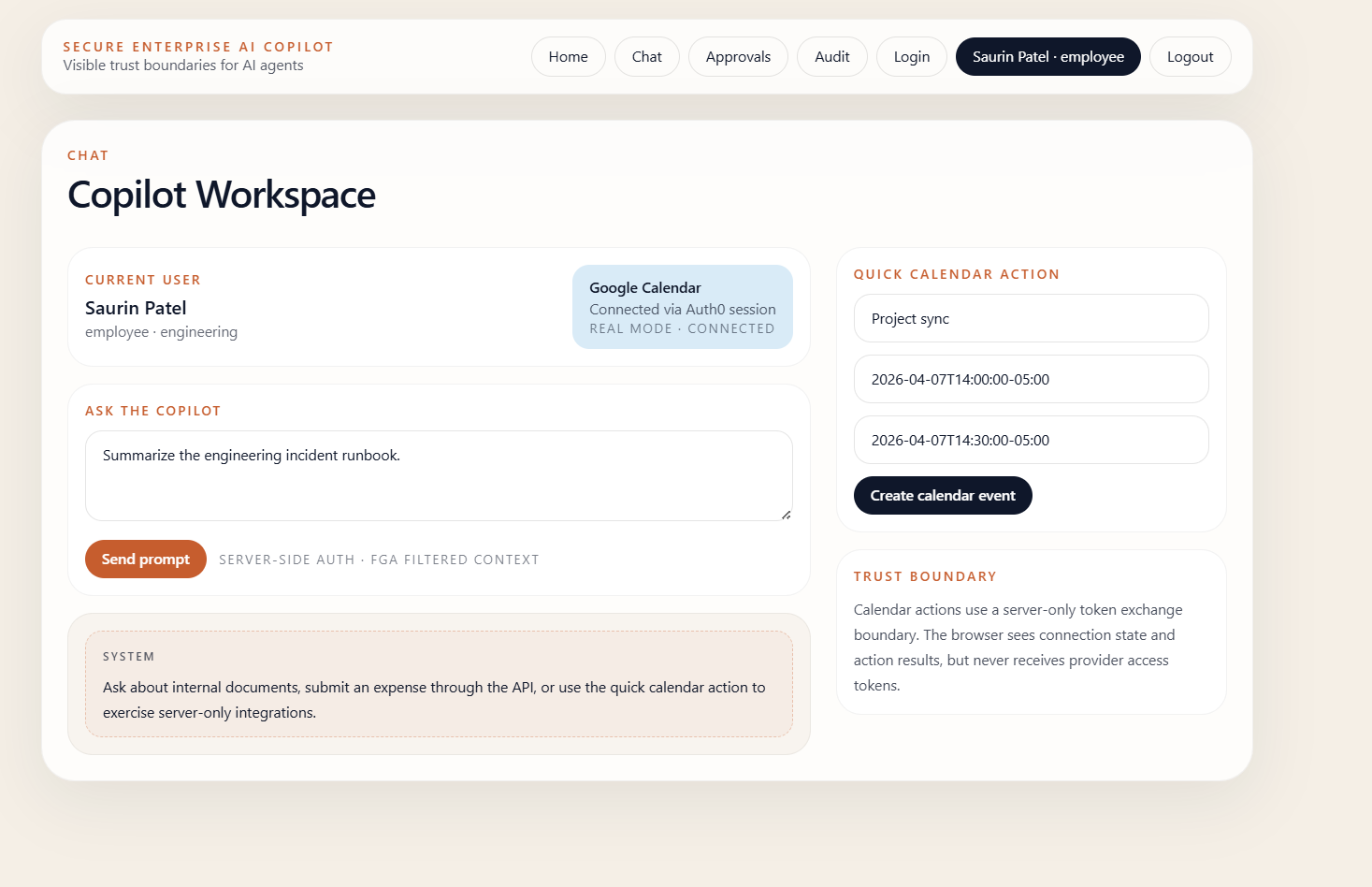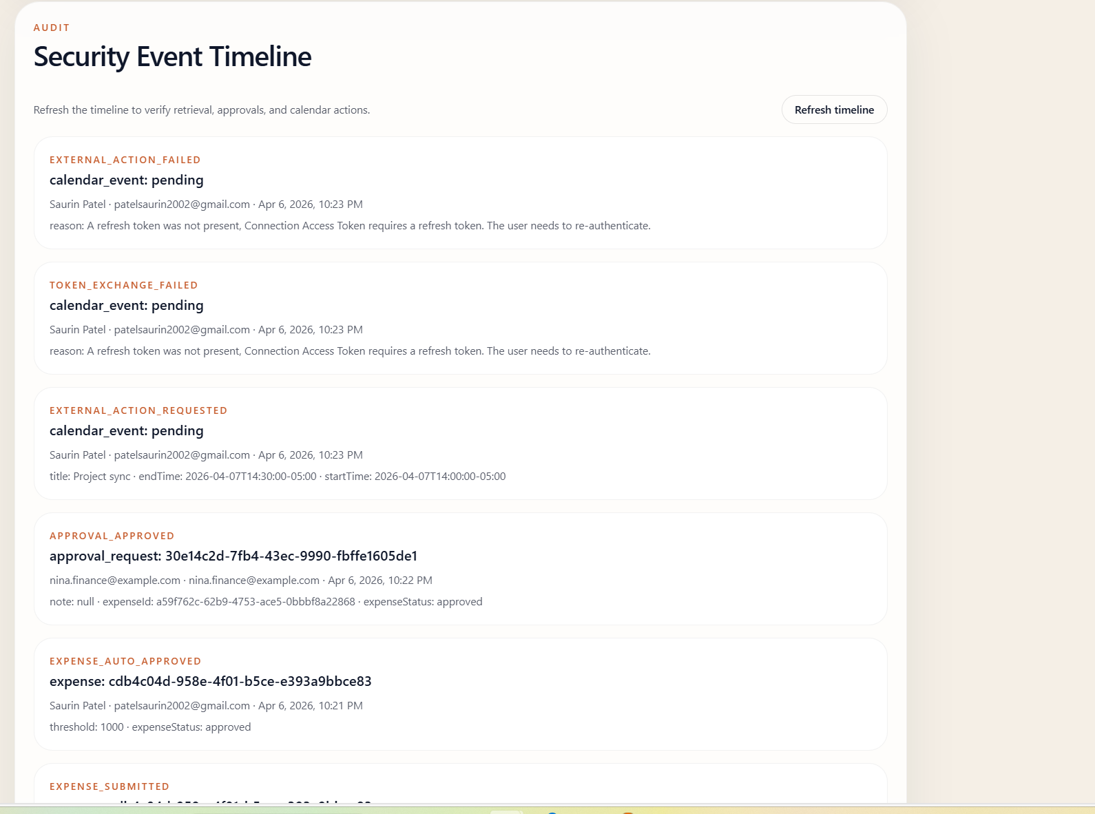 Browser → Auth0 Login → Next.js App Router ↓ FGA Authorization Boundary ↓ Secure RAG → only authorized chunks enter prompt ↓ Expense Flow → threshold policy → human approval queue ↓ Token Vault → server-only delegated token exchange ↓ Google Calendar API ↓ Audit Logger → every event recorded