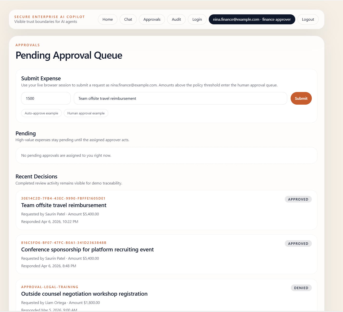 - Human-in-the-loop approval gates — High-value expenses and sensitive actions pause for explicit human approval before execution proceeds.