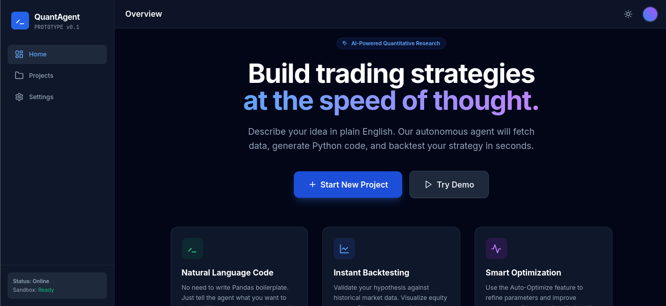 QuantAgent turns a trading idea written in plain English into a complete research pipeline. It automatically generates a proposal, gathers and prepares data, engineers features, writes strategy code, runs backtests, evaluates performance, and outputs both explanations and a working trading system.