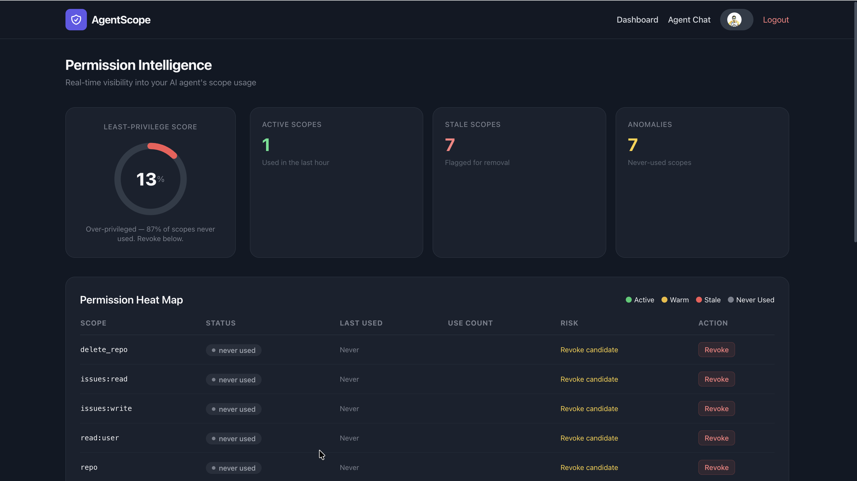 Our AgentScope dashboard addresses this by tracking behavioral baselines. If an agent has spent 50 API calls reading issues and suddenly tries to delete a repo, that's an anomaly worth flagging — even though the token technically allows it. We surface a "Least-Privilege Score" (used scopes / granted scopes) that gives users an at-a-glance measure of how over-privileged their agent is. In our testing, a typical agent uses only 25-35% of its granted scopes.