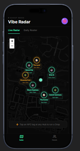 The Vibe Radar: Users open the map to see real-time heatmaps of active hubs and forming groups.