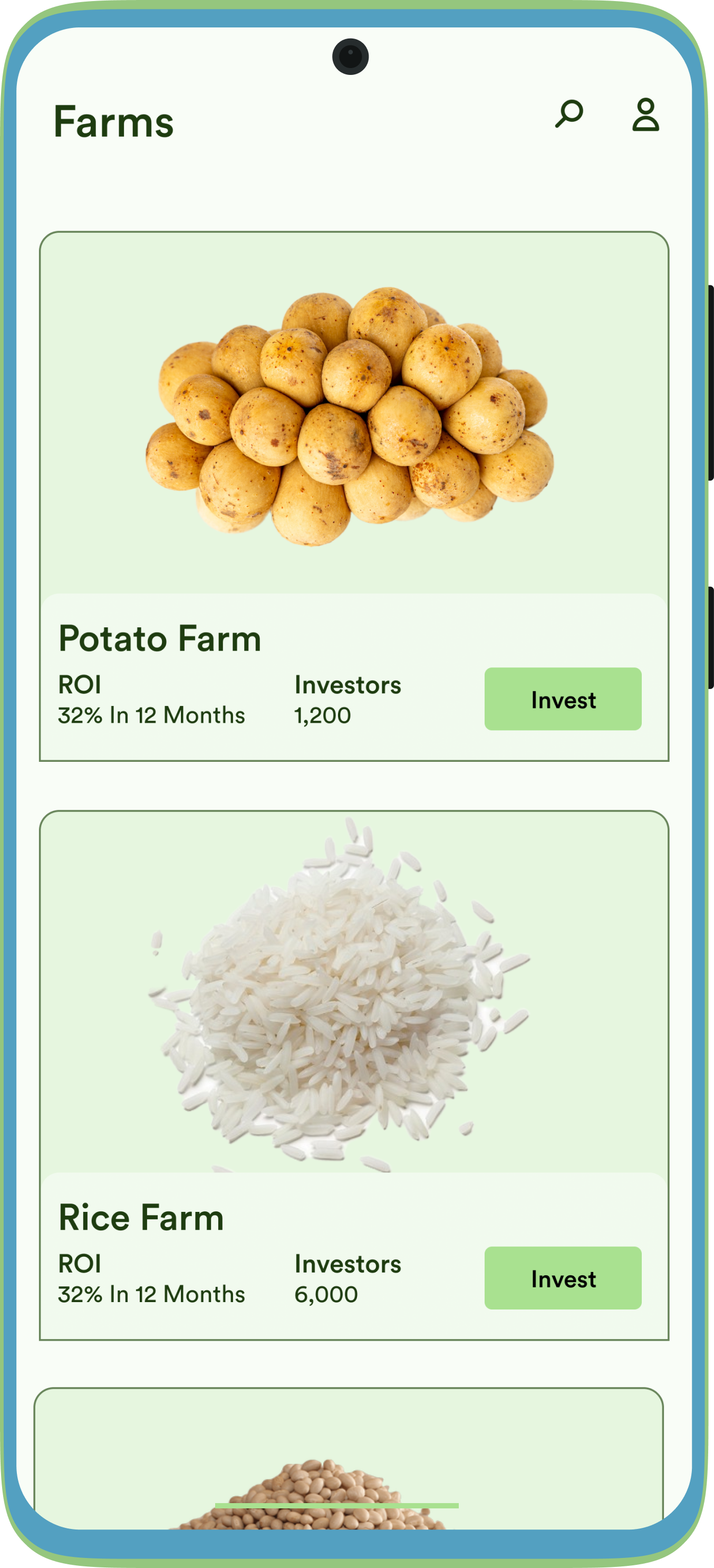A software application that allows the public to invest money in farming operations, providing farmers with the financial resources to be trained, acquire farm equipment, and maximize their crop yield. Farmers are then connected to key stakeholders in the food supply chain such as grocers, giving farmers the opportunity to sell their farm produce at a fair price.