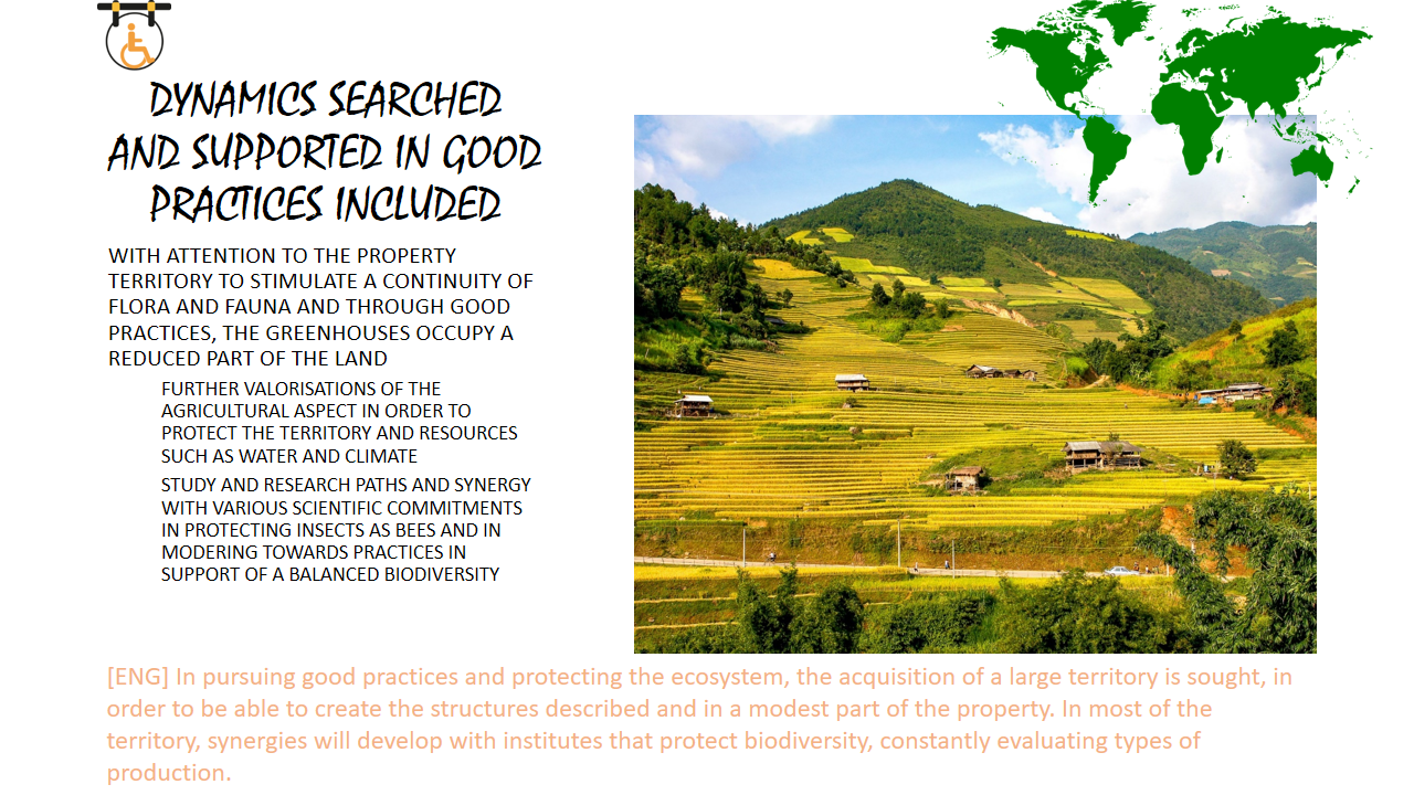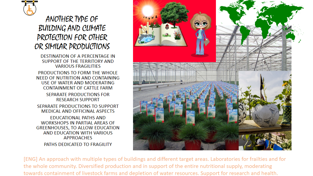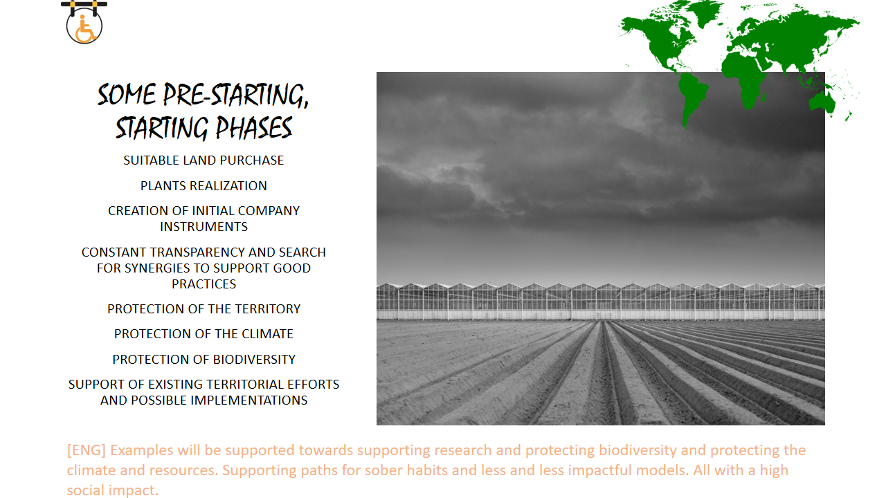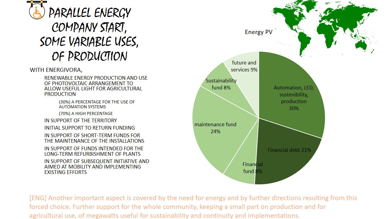 In a personal initiative, I try to create a photovoltaic greenhouse with a plant of about 6 MW and a likely innovative approach to support various lighting systems and an approach to support limited or absent use of water. In this direction, a thought is addressed to those who manage to further reduce the impact, limiting the use of meat and endowing themselves with nutritional breadth through flora. In this context of farm and energy company, the least possible contact with the expert is supported, while automation is valued albeit with less impact on maintenance and use of chemical products in support of the devices used. Also an approach with reduced intake of products for plants and particular attention to the surrounding environment, such as to allow the production of food but also to allow support of a much wider ecosystem and in which to fit in harmony. Every context of big data and analogies must be considered an objective among the main ones, this means isolated stations. In the project mentioned here, the HR aspect is widely supported in multiple directions. The educational and training aspect is also widely supported both towards the whole community and various actors, and towards collaborators. Once the initiative is launched, current efforts in the sector that are still small and in support of non-impacting or less impacting energy of fossil energies are supported. Once the various legal and administrative offices have been launched, territorial development will be based on community participation in various forms. A corporate welfare department will provide that resources are distributed in a significant percentage of production, towards fragility and the various actors engaged on several fronts. Another aspect provides a series of dynamics useful for creating forms of franchisors, no longer aimed at allowing enrichment but rather with a certain hearth response and turning to forms of ethics that cannot be interpreted. Other aspects foresee that the collaborator is stimulated to participate in local initiatives and in agreement with other realities, which will be able to take him on, considering the current contexts, allowing a further entry to the collaborator. A particular form of approach that includes known experiences of cooperatives and foundations and associations and beyond, without forgetting examples of speculative interpretations and their uses and consequences well known in the past and easy to re-present, especially as long as it is contextualized in economies and currencies and return and return and contentment and happiness today and well-being today.