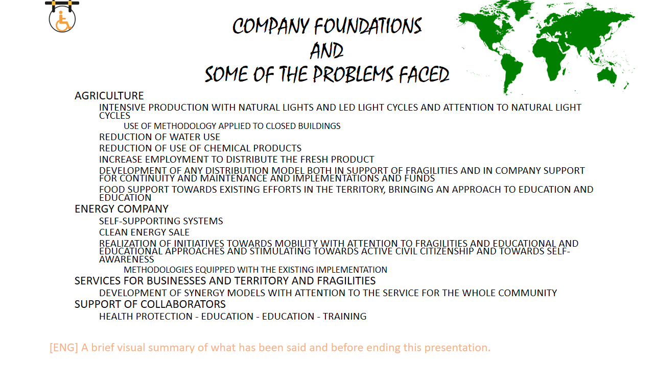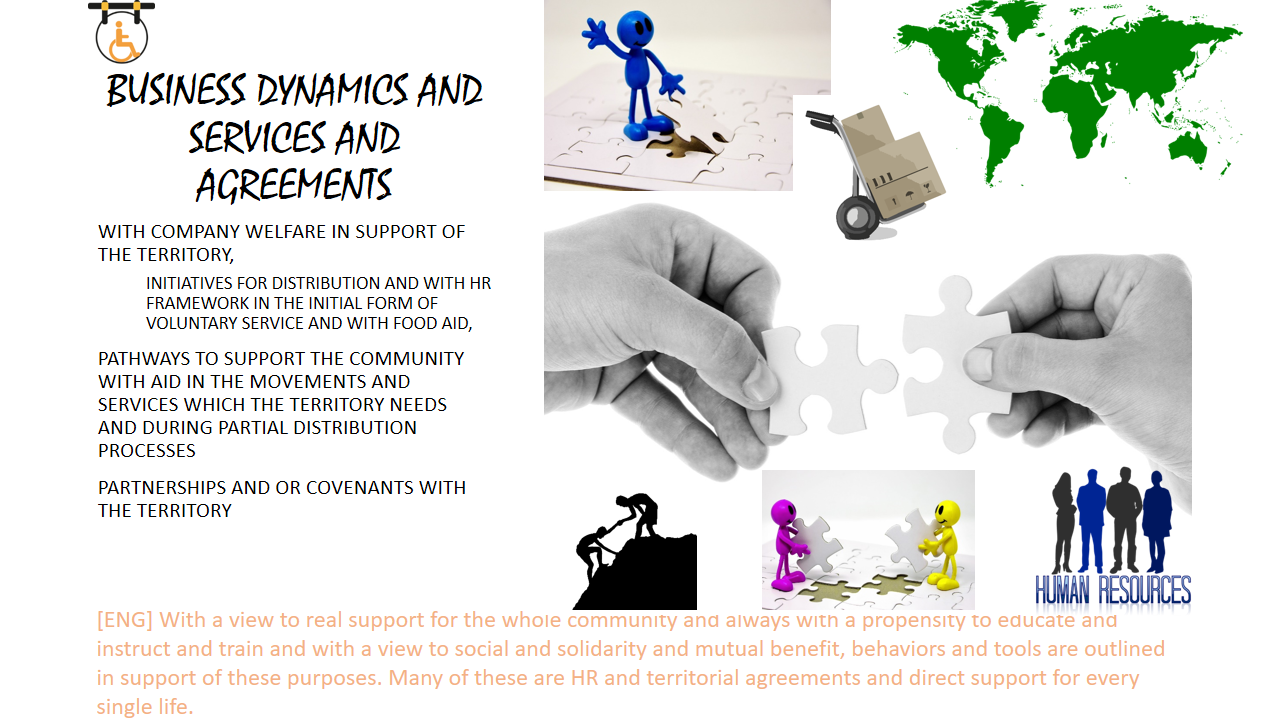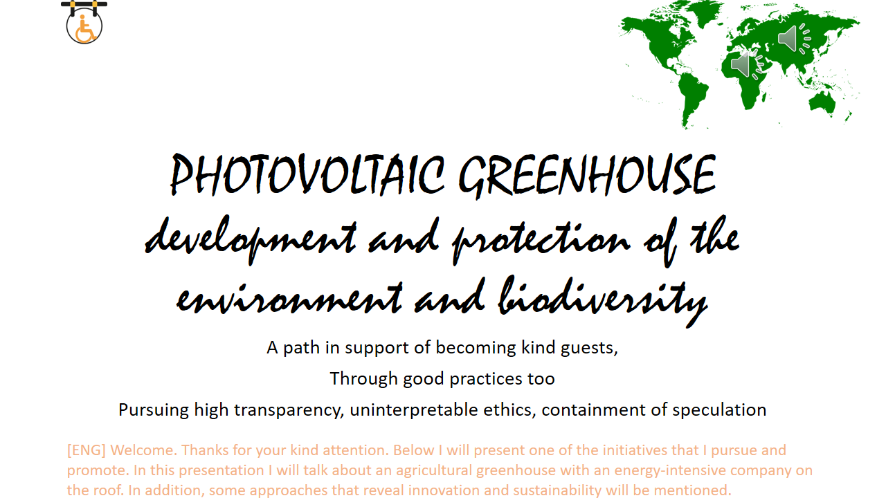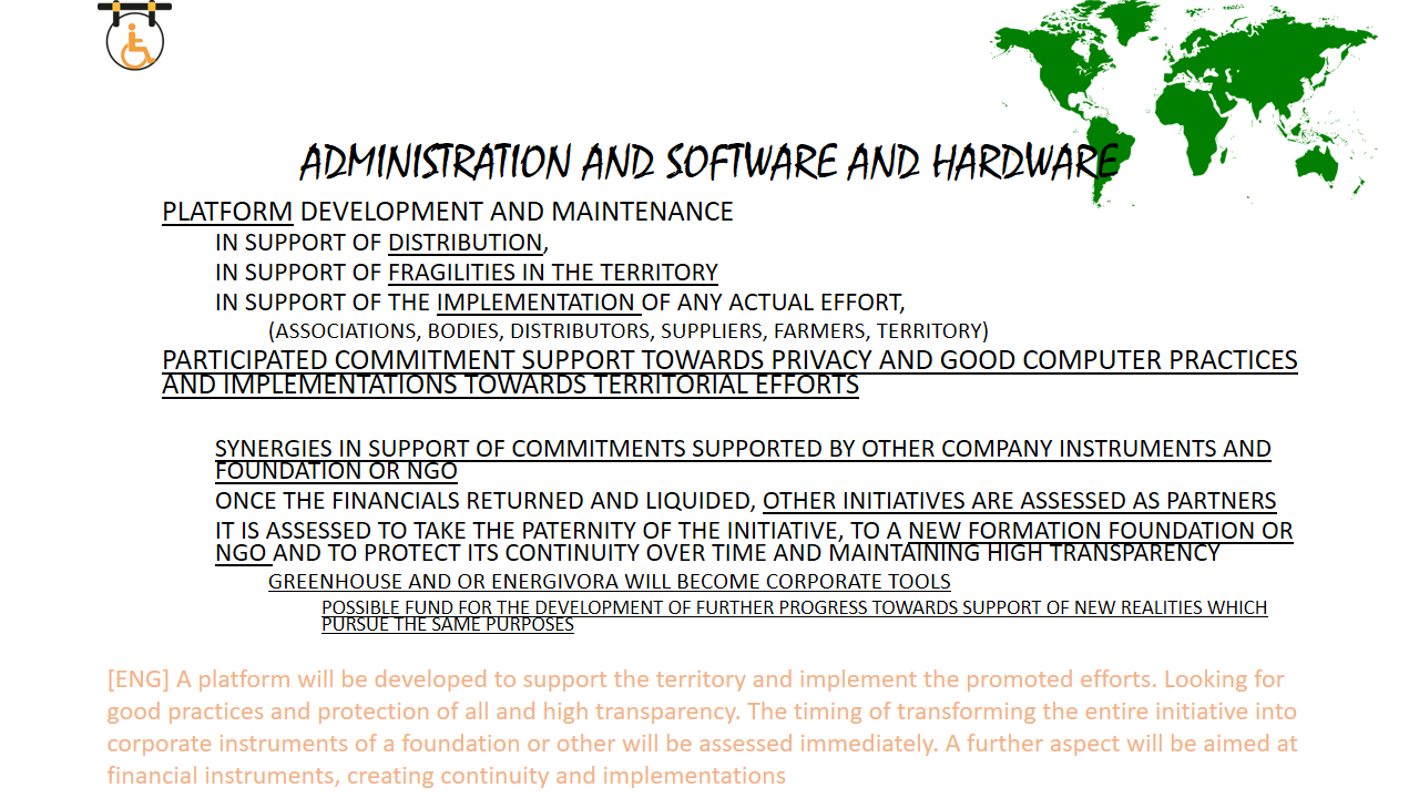 In a personal initiative, I try to create a photovoltaic greenhouse with a plant of about 6 MW and a likely innovative approach to support various lighting systems and an approach to support limited or absent use of water. In this direction, a thought is addressed to those who manage to further reduce the impact, limiting the use of meat and endowing themselves with nutritional breadth through flora. In this context of farm and energy company, the least possible contact with the expert is supported, while automation is valued albeit with less impact on maintenance and use of chemical products in support of the devices used. Also an approach with reduced intake of products for plants and particular attention to the surrounding environment, such as to allow the production of food but also to allow support of a much wider ecosystem and in which to fit in harmony. Every context of big data and analogies must be considered an objective among the main ones, this means isolated stations. In the project mentioned here, the HR aspect is widely supported in multiple directions. The educational and training aspect is also widely supported both towards the whole community and various actors, and towards collaborators. Once the initiative is launched, current efforts in the sector that are still small and in support of non-impacting or less impacting energy of fossil energies are supported. Once the various legal and administrative offices have been launched, territorial development will be based on community participation in various forms. A corporate welfare department will provide that resources are distributed in a significant percentage of production, towards fragility and the various actors engaged on several fronts. Another aspect provides a series of dynamics useful for creating forms of franchisors, no longer aimed at allowing enrichment but rather with a certain hearth response and turning to forms of ethics that cannot be interpreted. Other aspects foresee that the collaborator is stimulated to participate in local initiatives and in agreement with other realities, which will be able to take him on, considering the current contexts, allowing a further entry to the collaborator. A particular form of approach that includes known experiences of cooperatives and foundations and associations and beyond, without forgetting examples of speculative interpretations and their uses and consequences well known in the past and easy to re-present, especially as long as it is contextualized in economies and currencies and return and return and contentment and happiness today and well-being today.