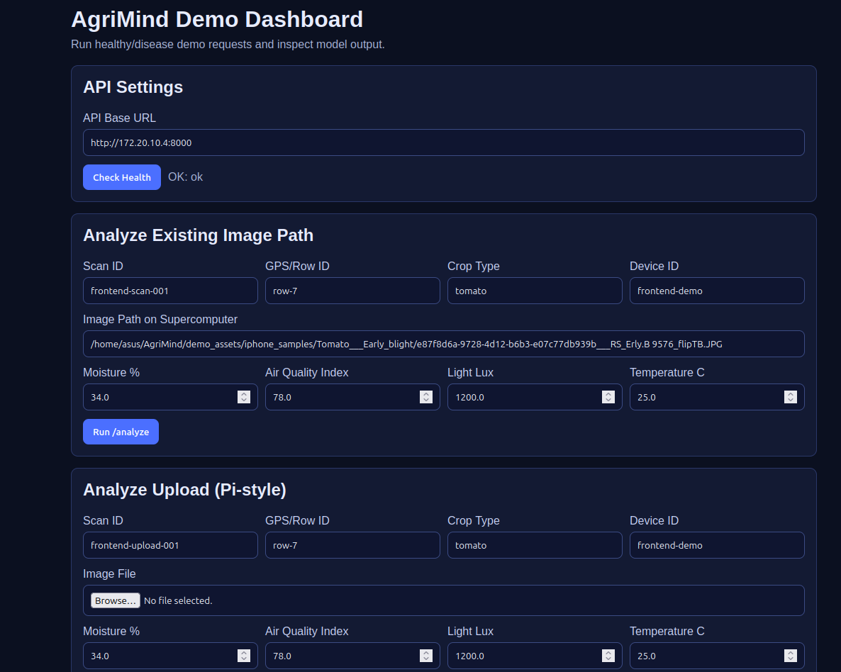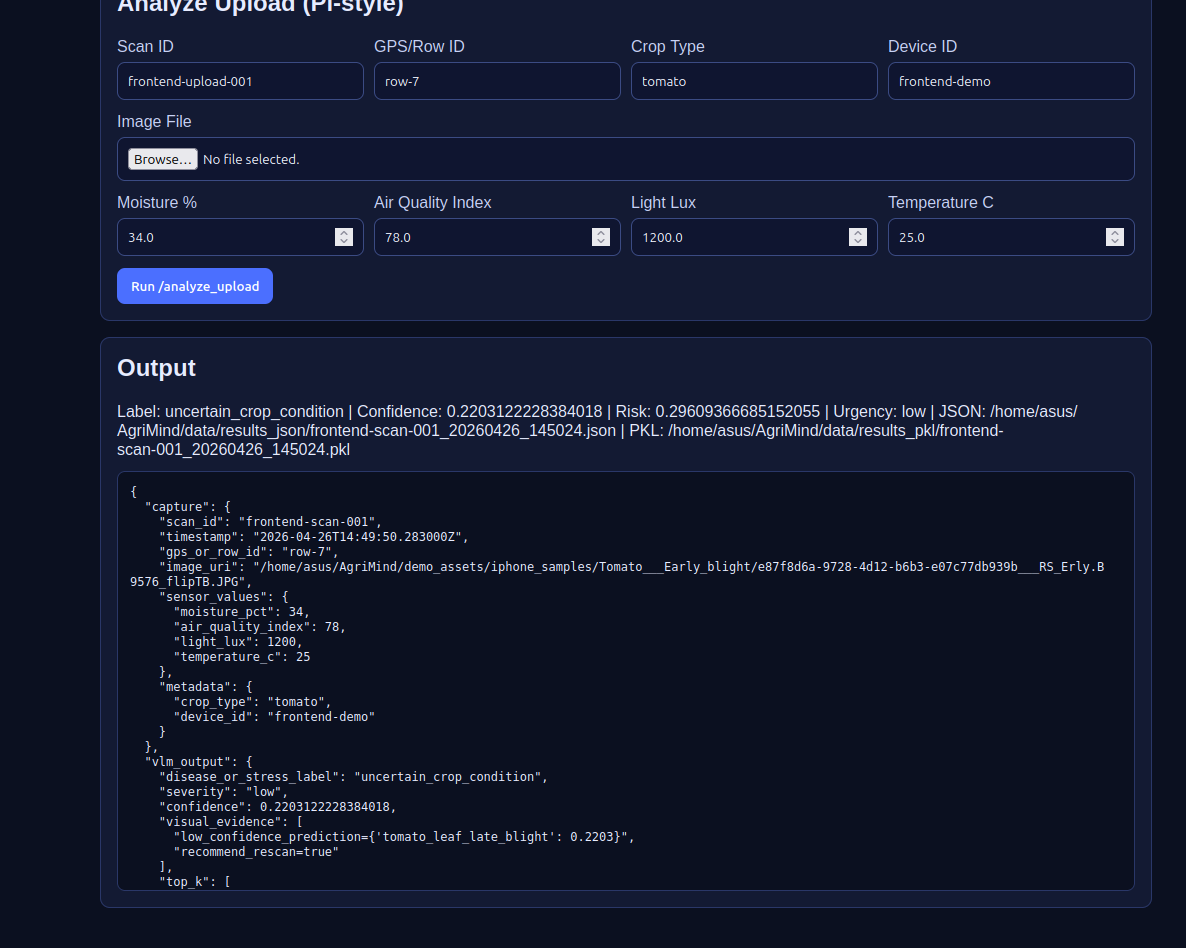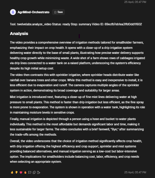 We built AgriMind because we saw these losses as a preventable intelligence gap. Farms already generate signals — temperature, moisture, light, and air-quality readings, visual crop images, and equipment footage — but most of that data is fragmented or underused. AgriMind brings it together in one system: sensor-driven irrigation decisions to reduce water waste, multimodal video understanding to flag equipment risks and unsustainable practices, and AI-based crop health analysis to catch disease earlier. Instead of reactive farming, we enable proactive, climate-smart action — helping growers protect yield, reduce resource waste, and improve sustainability without adding operational complexity.