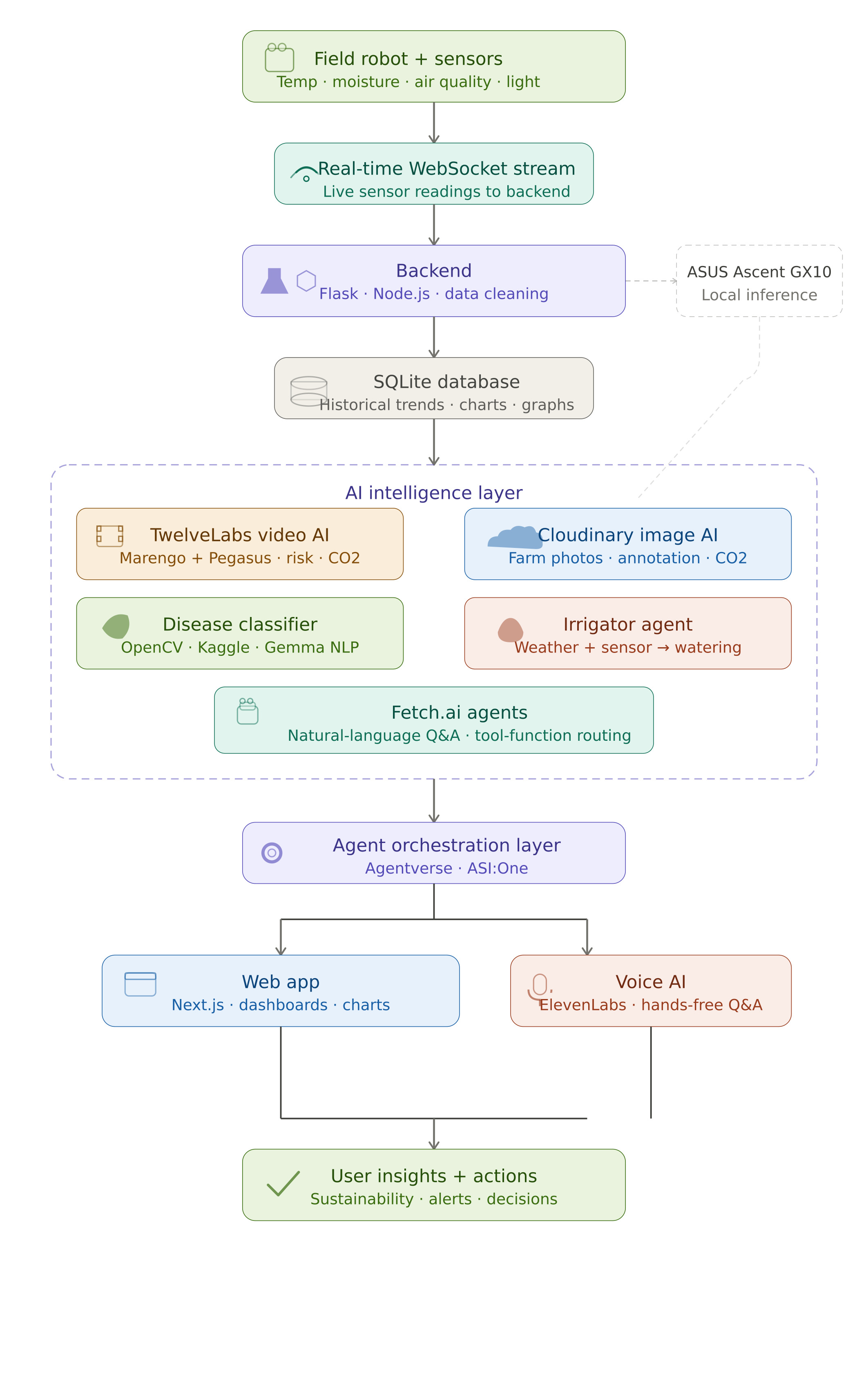 - Interact through ElevenLabs voice support to ask about sensor trends, agro-tech operations, and sustainability decisions hands-free.