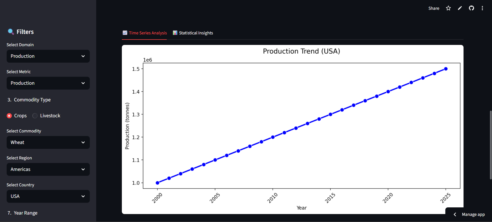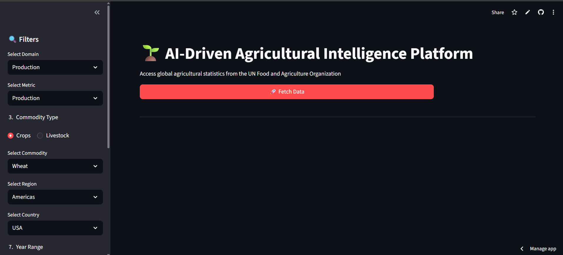 We built the app in Python with Streamlit for the UI, Pandas for data handling, and Matplotlib/Seaborn for visualization. The data layer is structured to integrate FAOSTAT sources, and the analytics pipeline is designed to summarize trends and support AI‑assisted interpretation (future expansion).