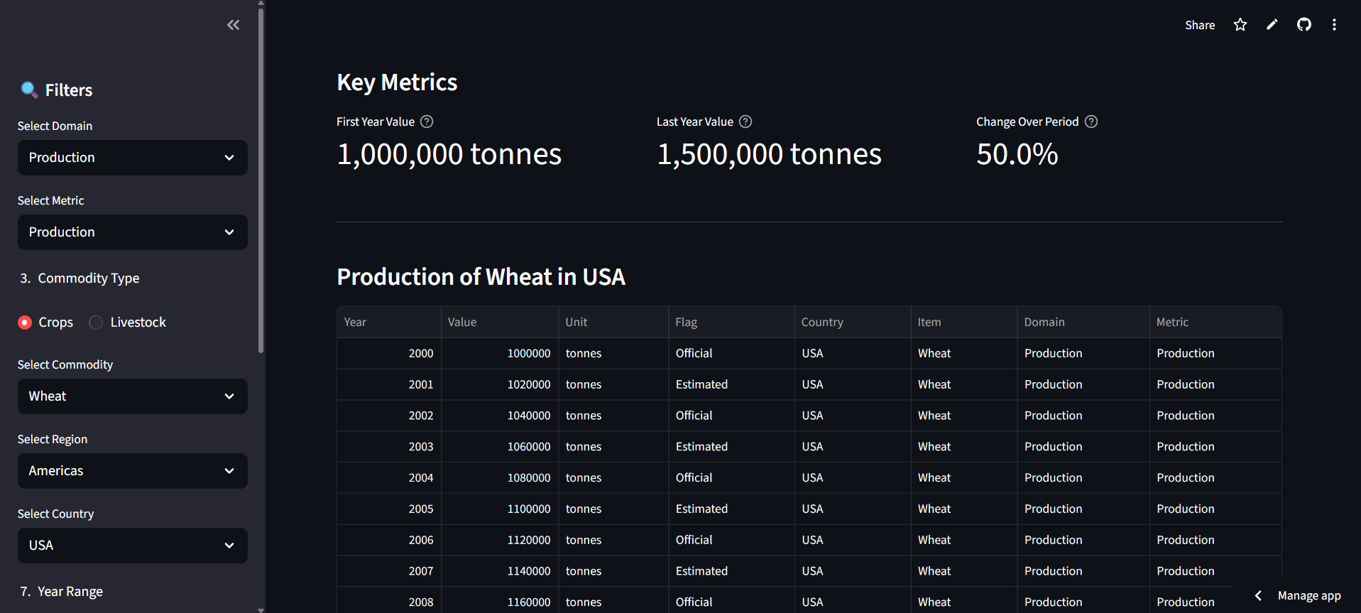 Mapping FAOSTAT codes to human‑readable categories and ensuring consistent time‑series summaries were challenging. We also had to balance clarity and performance in the UI while keeping the app simple for non‑technical users.