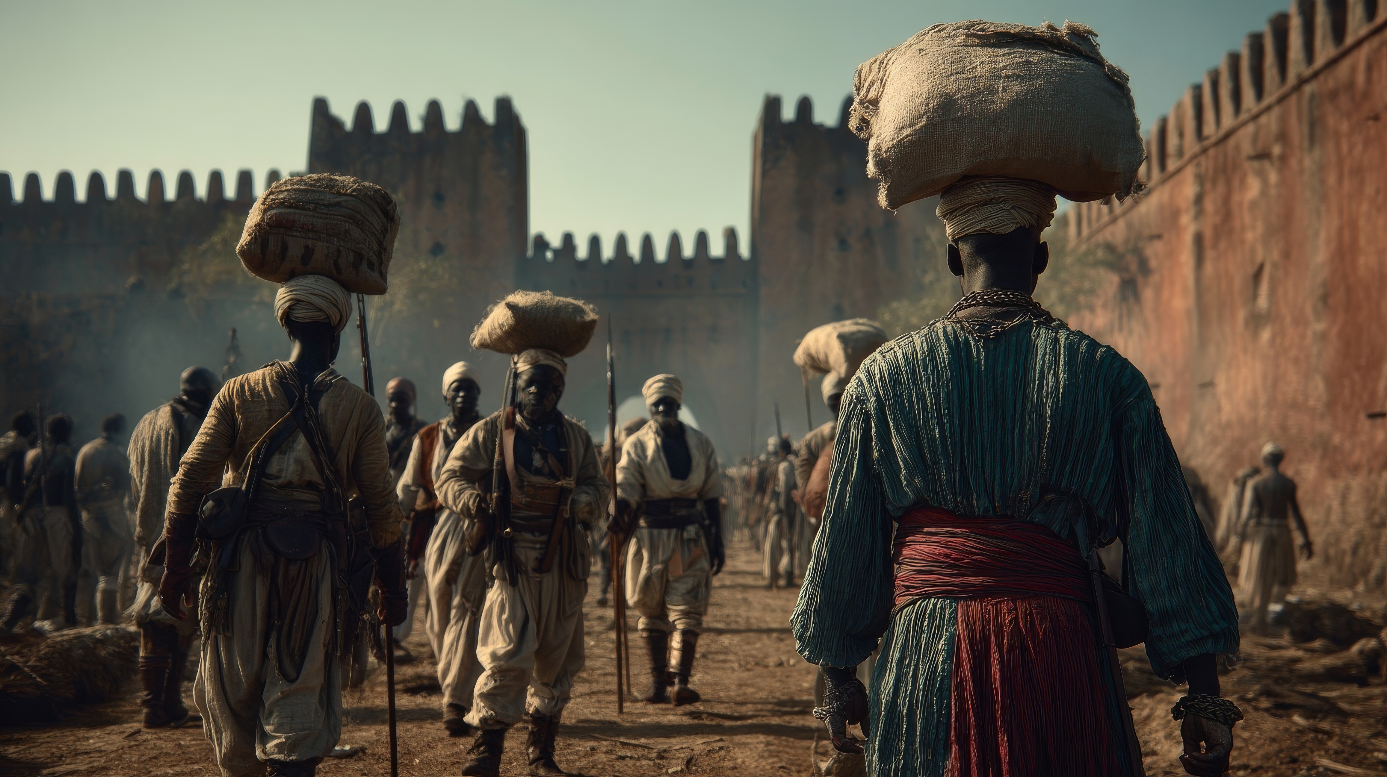 Each scene was created to feel like a lost historical epic, where West African tribes, Baltic fighters, and Arabian desert warriors appear as living snapshots of imagined pasts.