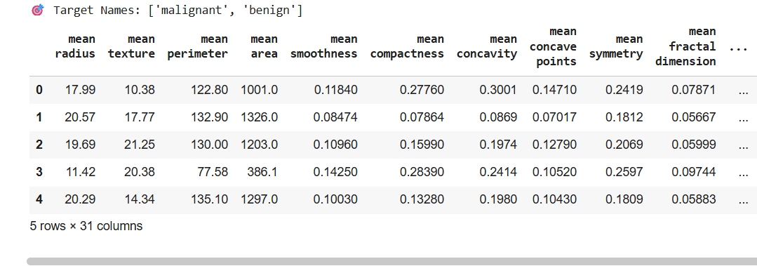 “Preview of the breast cancer dataset showing key clinical features used for training the AI model.”