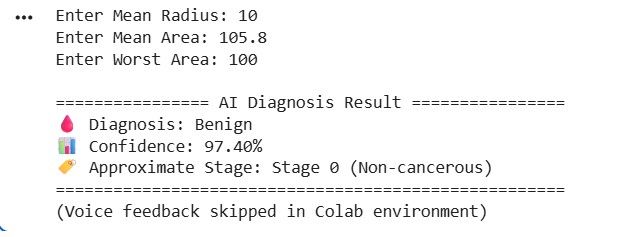 “Real-time manual input diagnosis output showing prediction, confidence score and stage approximation.”