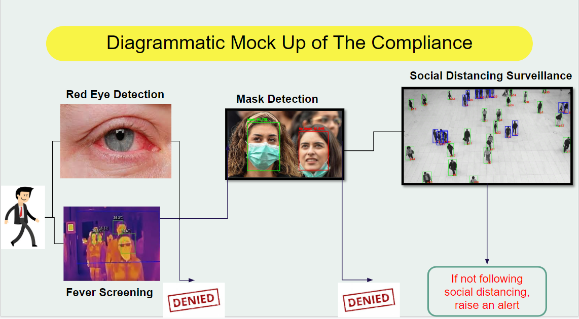 As AI is the most leveraging technology, we choose it to make our Compliance solution to monitor such prevention factors and alarm the concerned authorities whether people are following the norms or not. Our Compliance consists of state-of-the-Art screening of people carrying corona virus symptoms such as fever, redness in eye, not wearing mask and not following social distancing