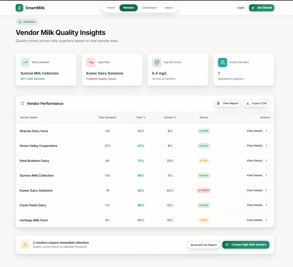 Vendor‑wise milk quality insights showing performance, risk levels, and safety trends across suppliers.