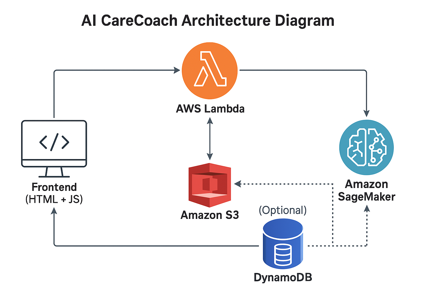 We built AI CareCoach as a serverless web app using: • Frontend: HTML5, CSS3, JavaScript (Vanilla JS) • Cloud Backend: AWS Lambda (Python) + Amazon S3 for content retrieval • Data: JSON-based RAG (Retrieval Augmented Generation) knowledge sets derived from China’s official Long-Term Care Worker Training Textbook • AI Assistant: In-browser reasoning and voice response via Web Speech API • Local Storage: For offline tracking of progress, achievements, and study time The architecture enables both cloud-based scalability and local offline usability, suitable for caregivers in low-bandwidth environments.