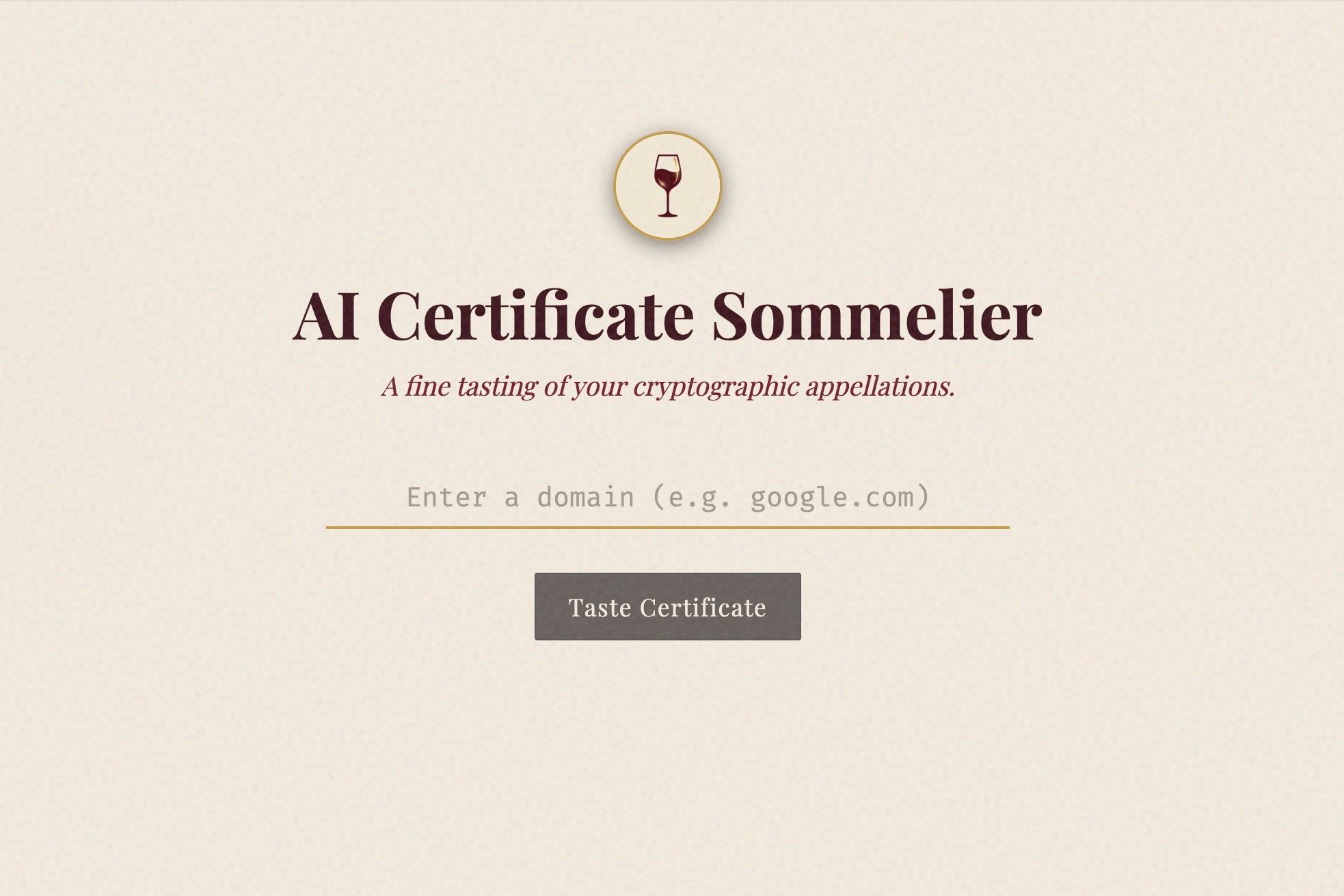 AI Certificate Sommelier is a high-end tasting experience for your cryptographic appellations. You enter a domain name, and the application opens a secure socket to natively extract its SSL certificate data.