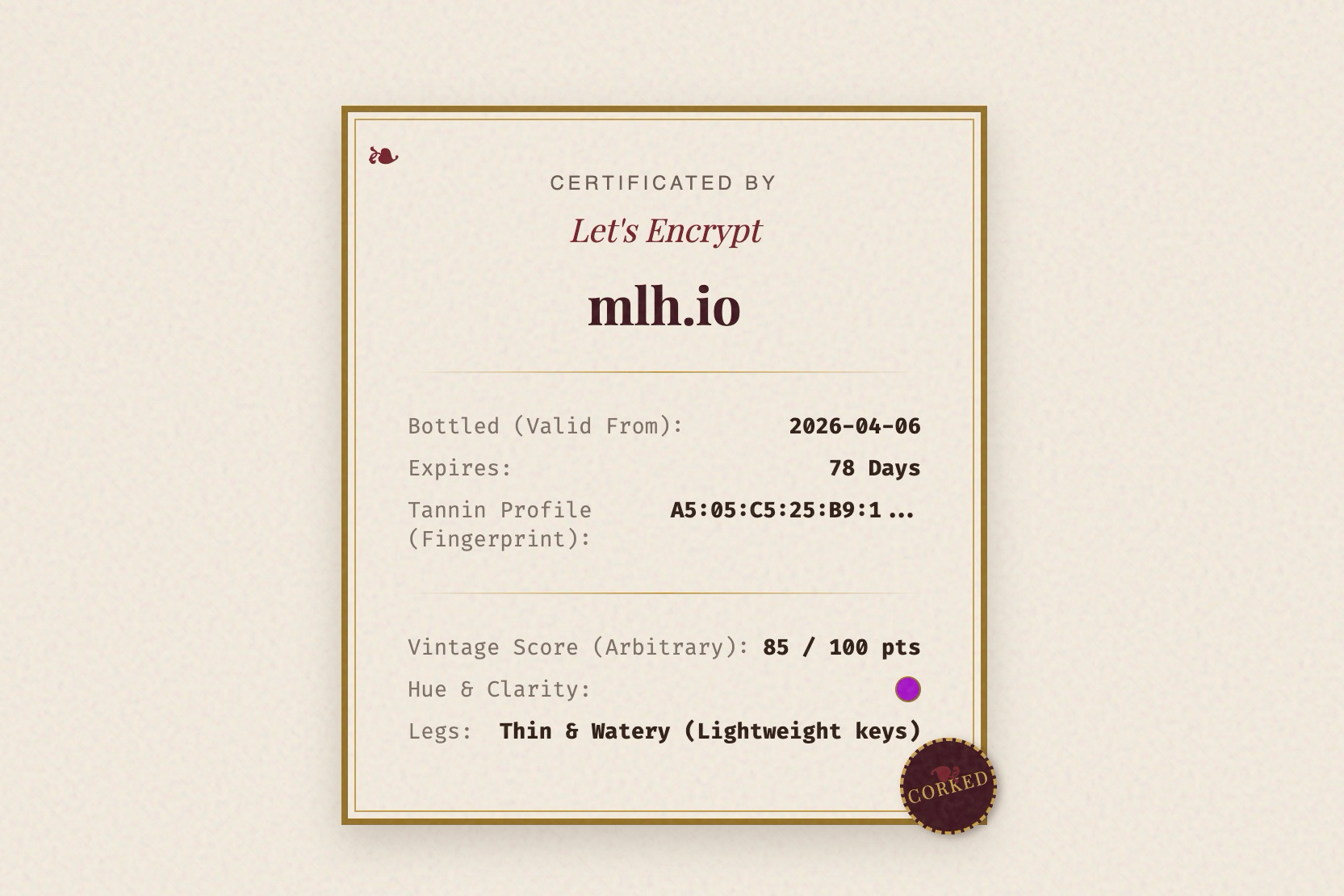 - Meaningless Metrics: It extrapolates arbitrary "Tasting Metrics" mathematically derived from the certificate's fingerprint, assigning it an arbitrary Vintage Score, "Hue" (CSS Hex code), and physical "Legs".