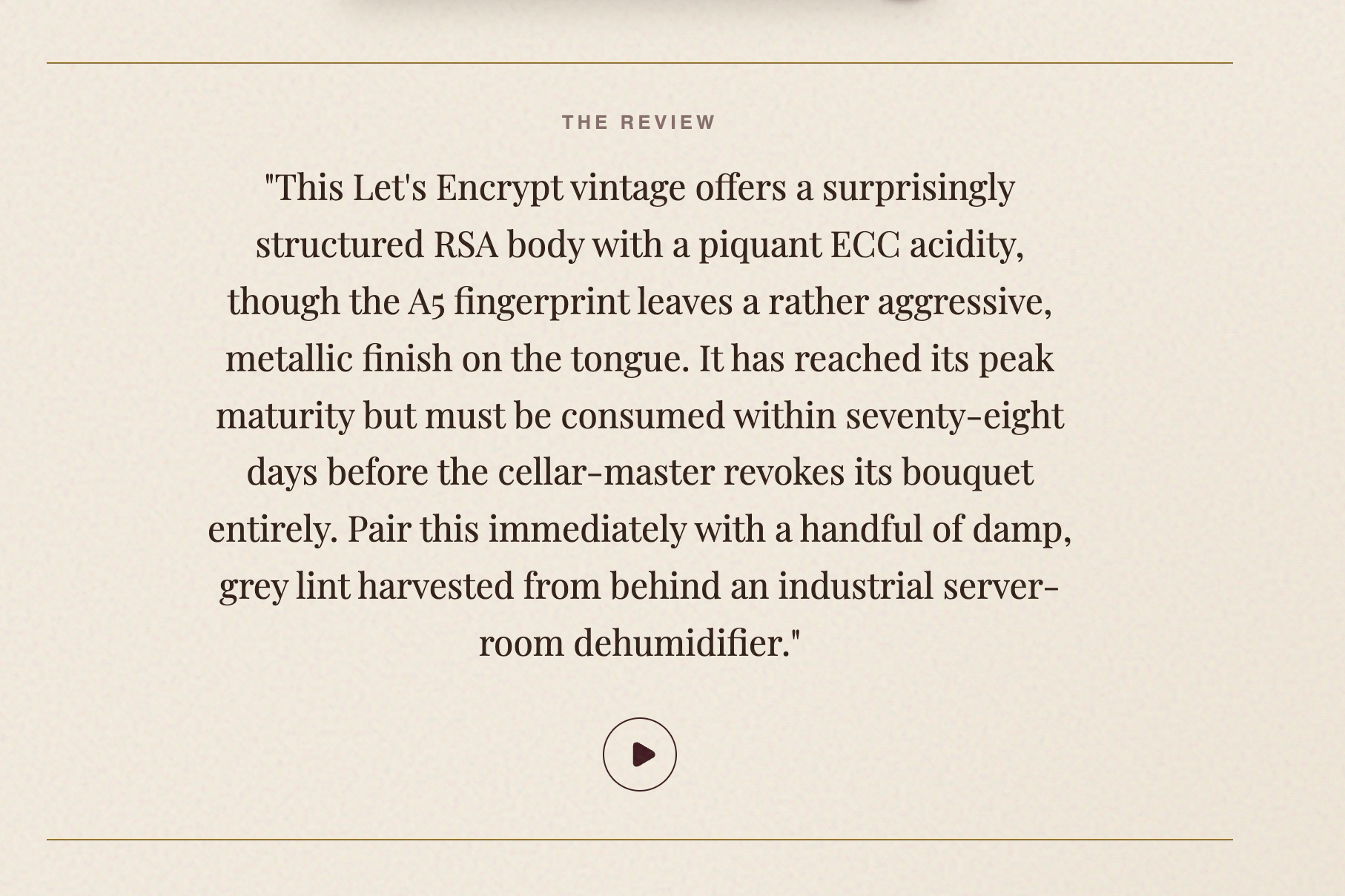 The tech industry often takes itself far too seriously, and hackathon projects are usually racing to solve the world's biggest productivity problems. I wanted to build the exact opposite: something technologically sophisticated but fundamentally, unapologetically useless. I looked at the most invisible, boring piece of internet infrastructure [SSL/TLS certificates] and decided they deserved to be treated with the absurd, pretentious reverence of a $5,000 bottle of wine.
