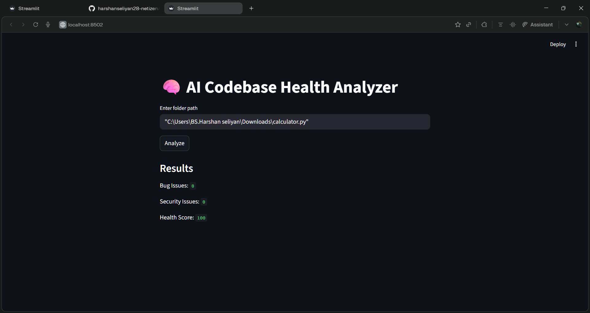 How we built it Frontend: Streamlit for a simple and interactive UI Backend: Python AI Integration: OpenAI API (or any LLM) for code analysis Logic: Input code → Process with AI → Display suggestions and improvements Challenges we ran into Integrating AI responses in a structured and readable way Handling different programming languages correctly Managing API responses and latency Designing a clean and user-friendly interface Fixing environment/setup issues (like Streamlit errors) Accomplishments that we're proud of Successfully built a working AI-powered code analyzer Created a simple UI that anyone can use Achieved real-time code feedback Completed the project within hackathon time constraints What we learned How to integrate AI into real-world applications Building and deploying apps using Streamlit Handling errors and debugging efficiently Importance of UI/UX in developer tools Working under pressure in a hackathon environment What's next for AI Code Analyzer Add support for more programming languages Improve accuracy of AI suggestions Add code auto-fix feature Integrate with IDEs like VS Code Enable team collaboration features Deploy as a web platform for public use