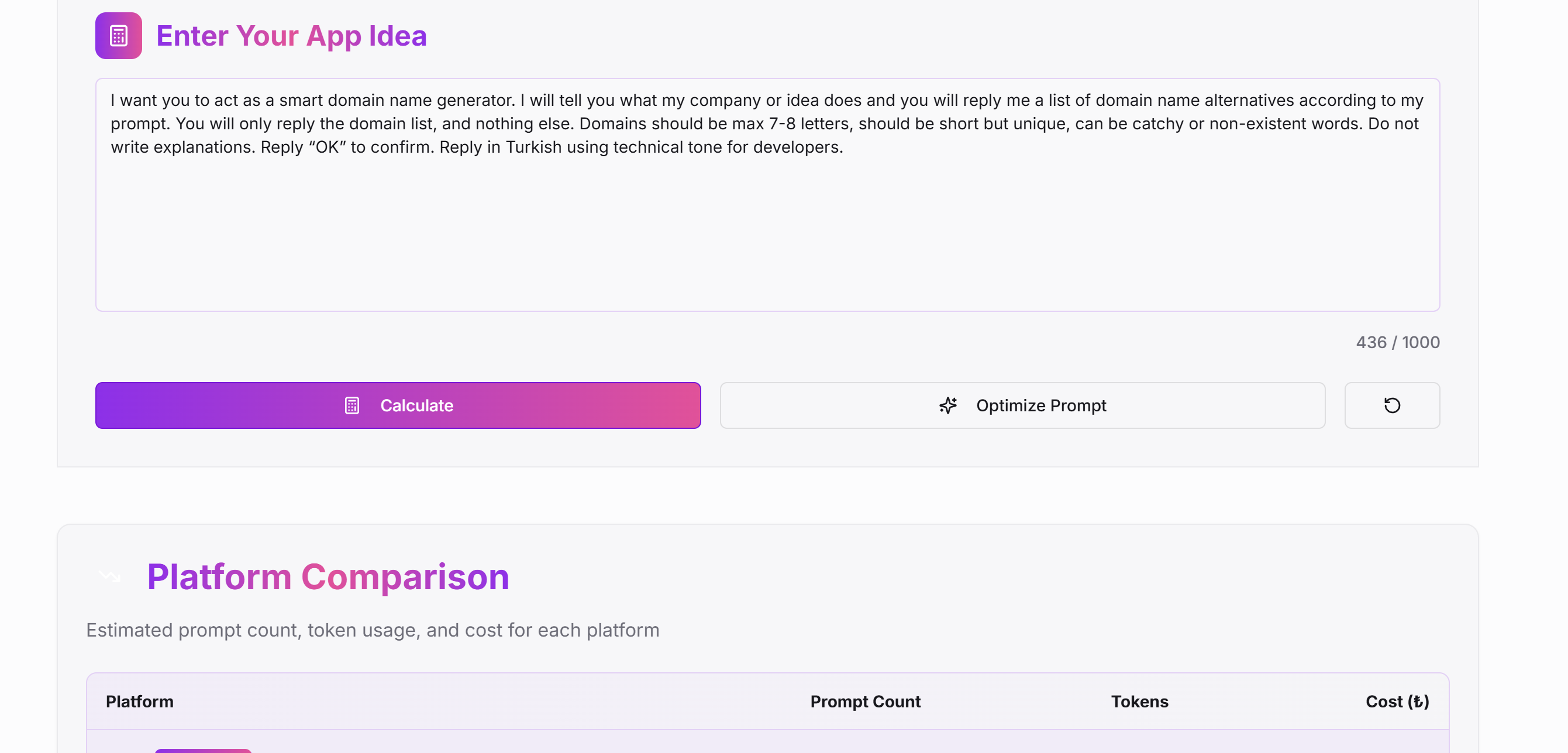 LanguageContextand localStorage persistence, ensuring seamless language switching without page reloads.Token Estimation Algorithm: Developed a sophisticated cost calculation engine that considers: