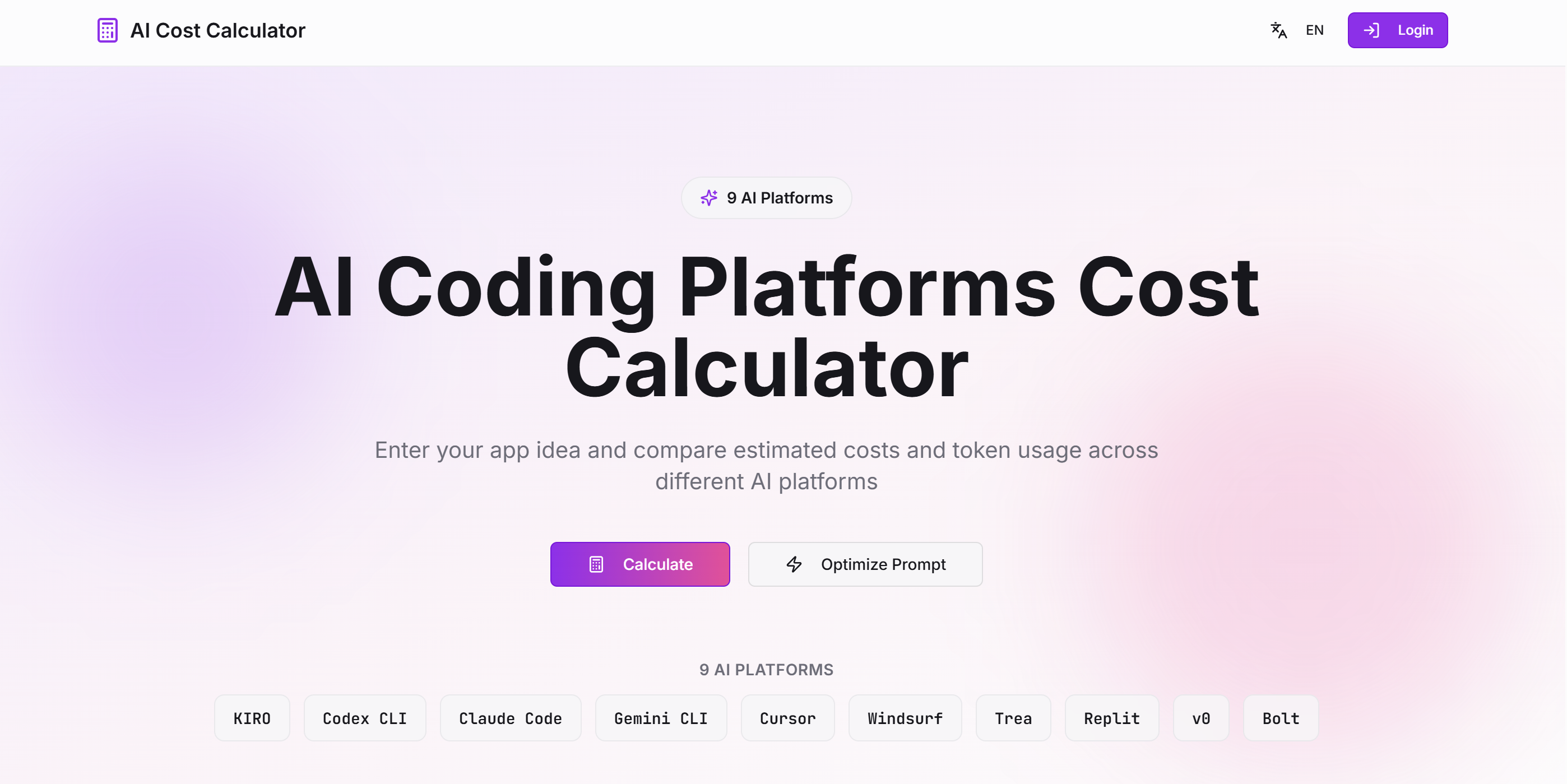 AI Platform Cost Calculator is a comprehensive web application that helps developers and businesses estimate the costs of building applications across 10 different AI coding platforms. In today's rapidly evolving AI development landscape, understanding the financial implications of choosing different AI-assisted coding tools has become crucial for project planning and budgeting.