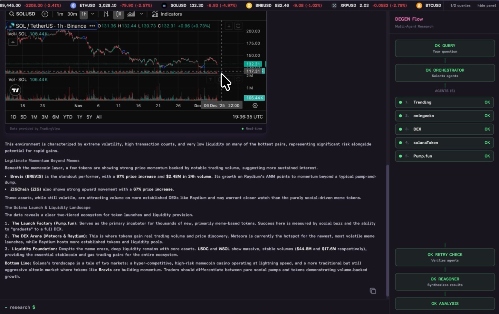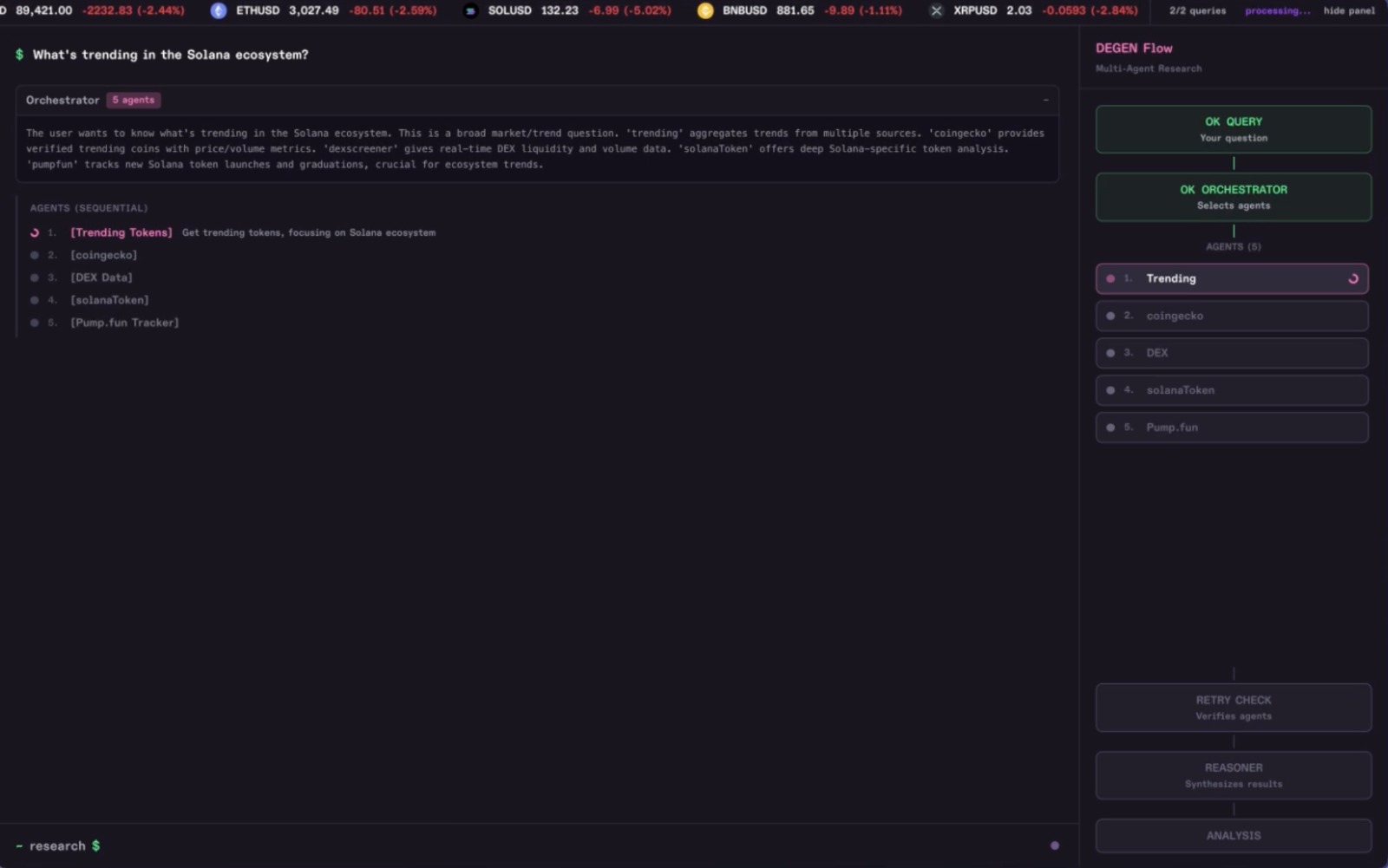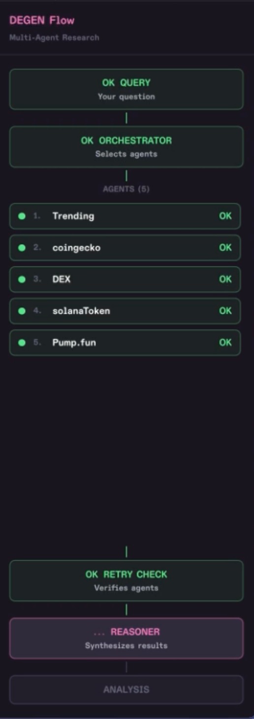 Crypto research is fragmented. To analyze a single token, traders must check CoinGecko for prices, DeFiLlama for TVL, Twitter for sentiment, on-chain explorers for whale movements, and news sites for context. I wanted to build a system where you just ask a question and AI agents do all the research for you in parallel.