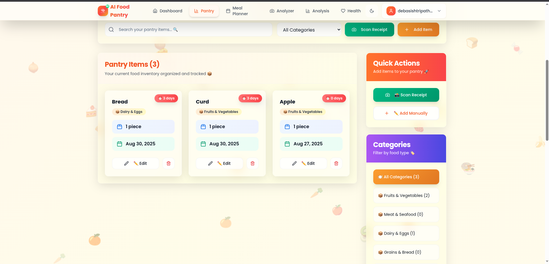 💡 What It Does AI Food Pantry is a GenAI-powered platform that revolutionizes how individuals and communities manage food, reduce waste, and access personalized nutrition—all from their kitchens.