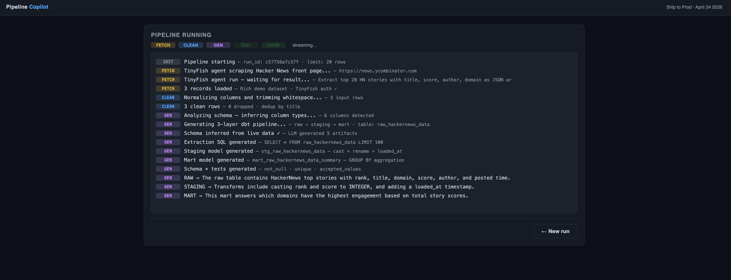 Input a prompt describing the analysis they want to perform Scrape real-world data from sources such as Y Combinator, Hacker News, and Product Hunt Clean and structure the collected data Generate dbt-style transformation logic using AI, including staging models, mart models, and schema tests Load the processed data into a Postgres-based warehouse Validate the pipeline through data quality checks Query the resulting dataset using natural language (text-to-SQL)