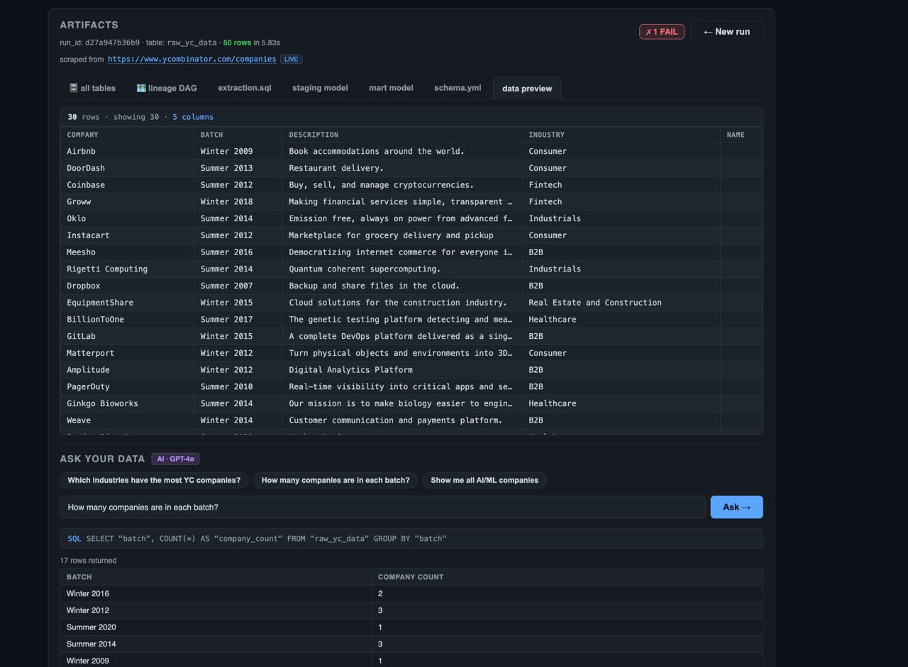 Final data preview and AI query results showing YC companies, batches, and aggregated insights.