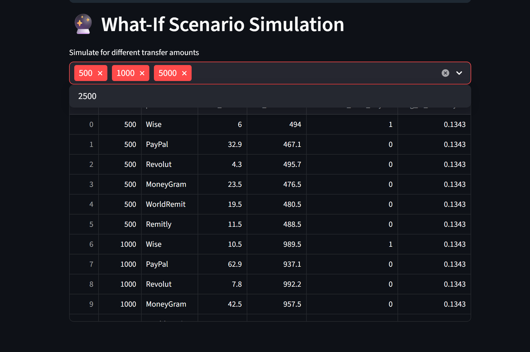 Users enter the sender country, receiver country, transfer amount, and their priority (cheapest, fastest, or balanced). The system then: