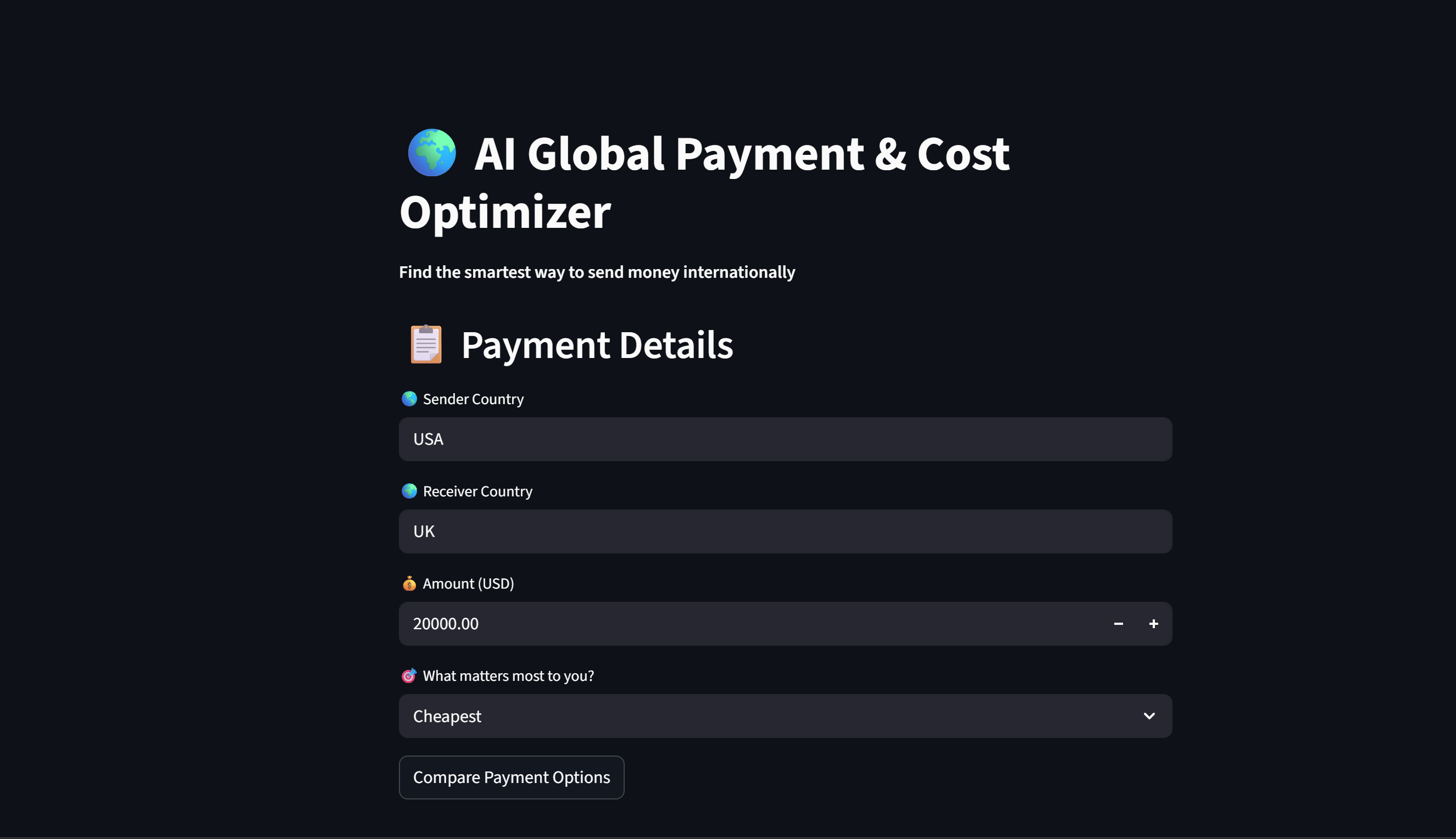 AI Global Payment & Cost Optimizer helps users find the smartest way to send money internationally.