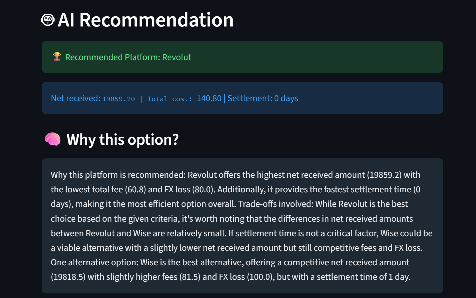 - Calculates real fees and FX losses using transparent, rule-based logic