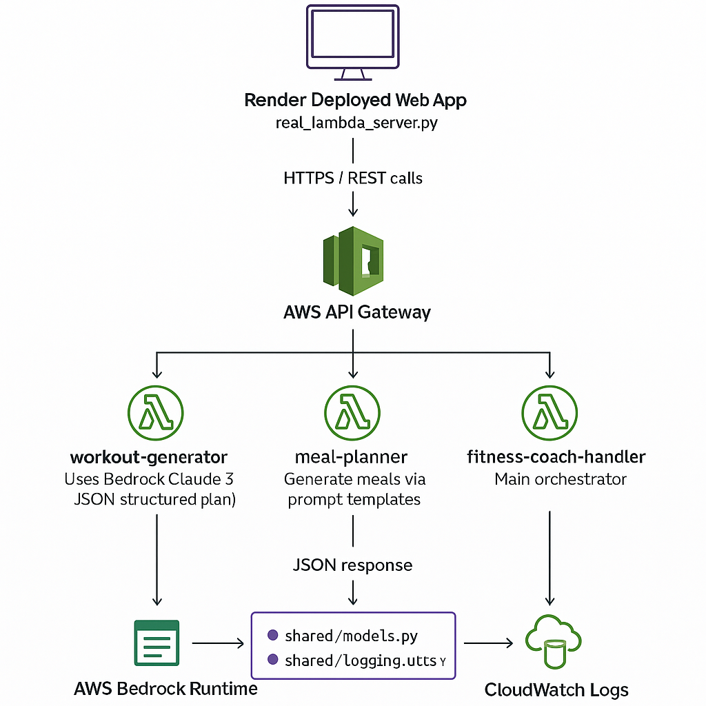 We built the backend using AWS Lambda functions integrated with Bedrock for AI generation. The frontend runs on a lightweight local server that talks directly with these Lambda functions. Everything is connected, the workout generator, meal planner, and fitness chat assistant — all running serverlessly and efficiently.