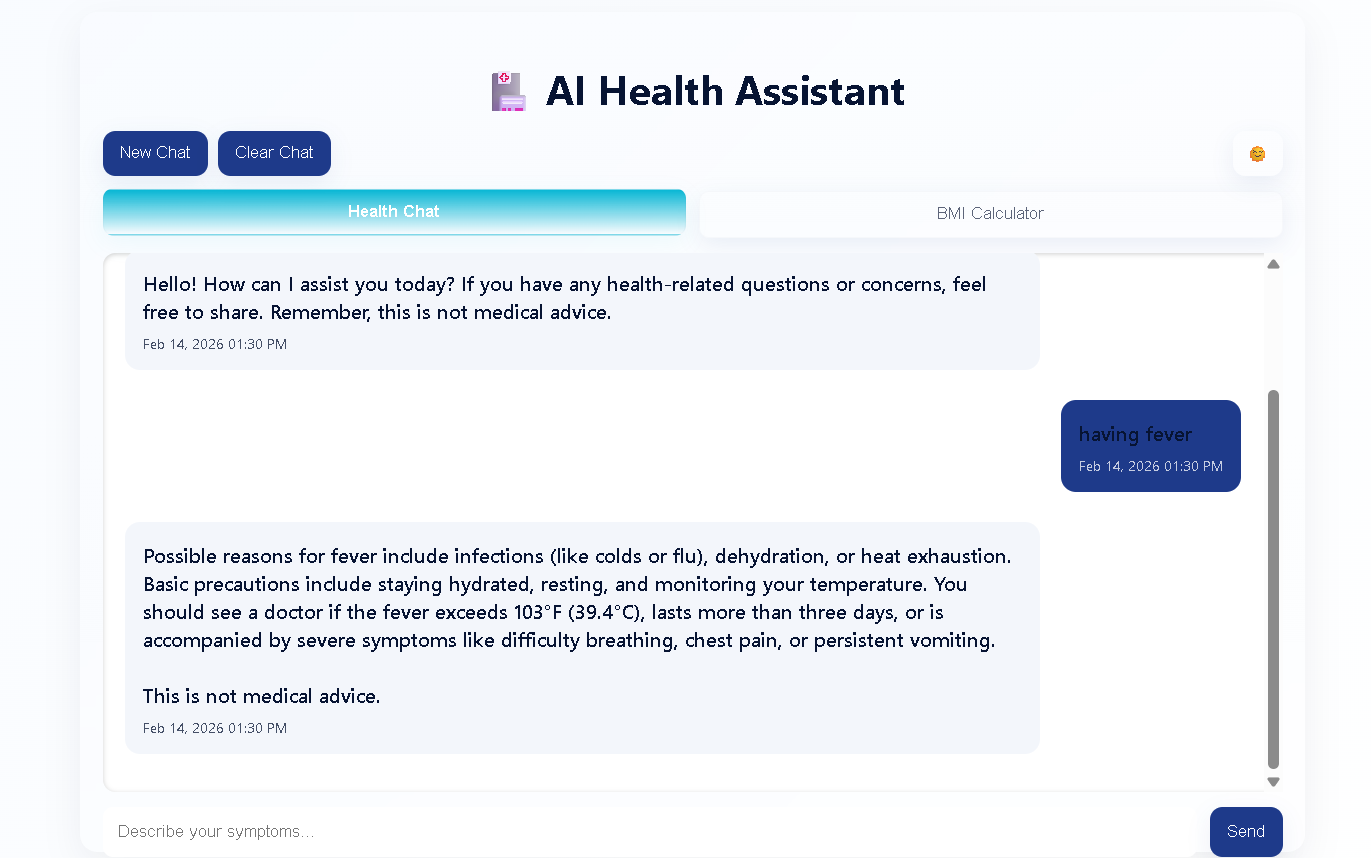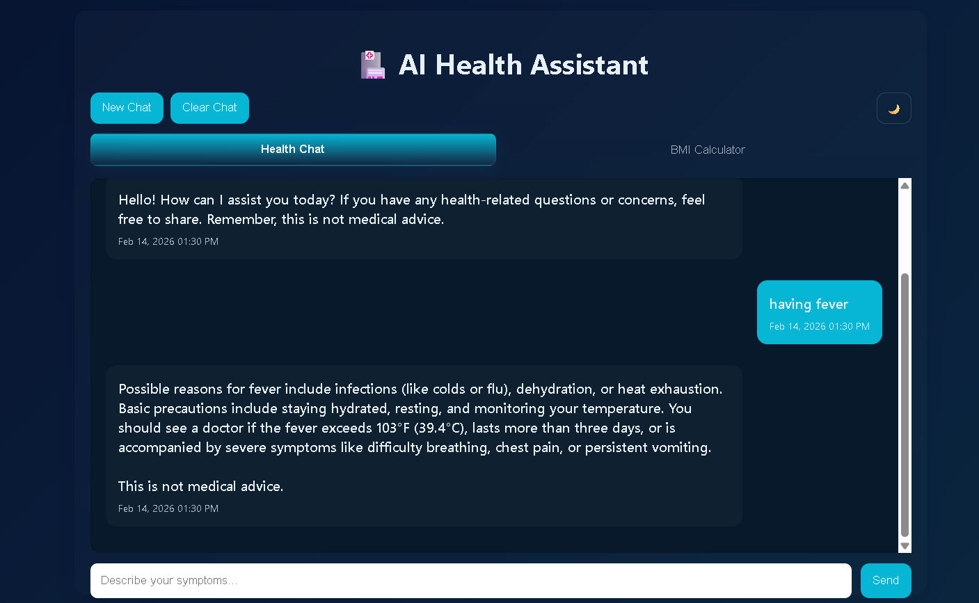 AI Health Assistant is a web-based healthcare companion that allows users to describe symptoms and receive instant AI-generated health guidance, precautions, and recommendations on when to seek medical help. It also includes a BMI calculator for basic health tracking and promotes early health awareness.