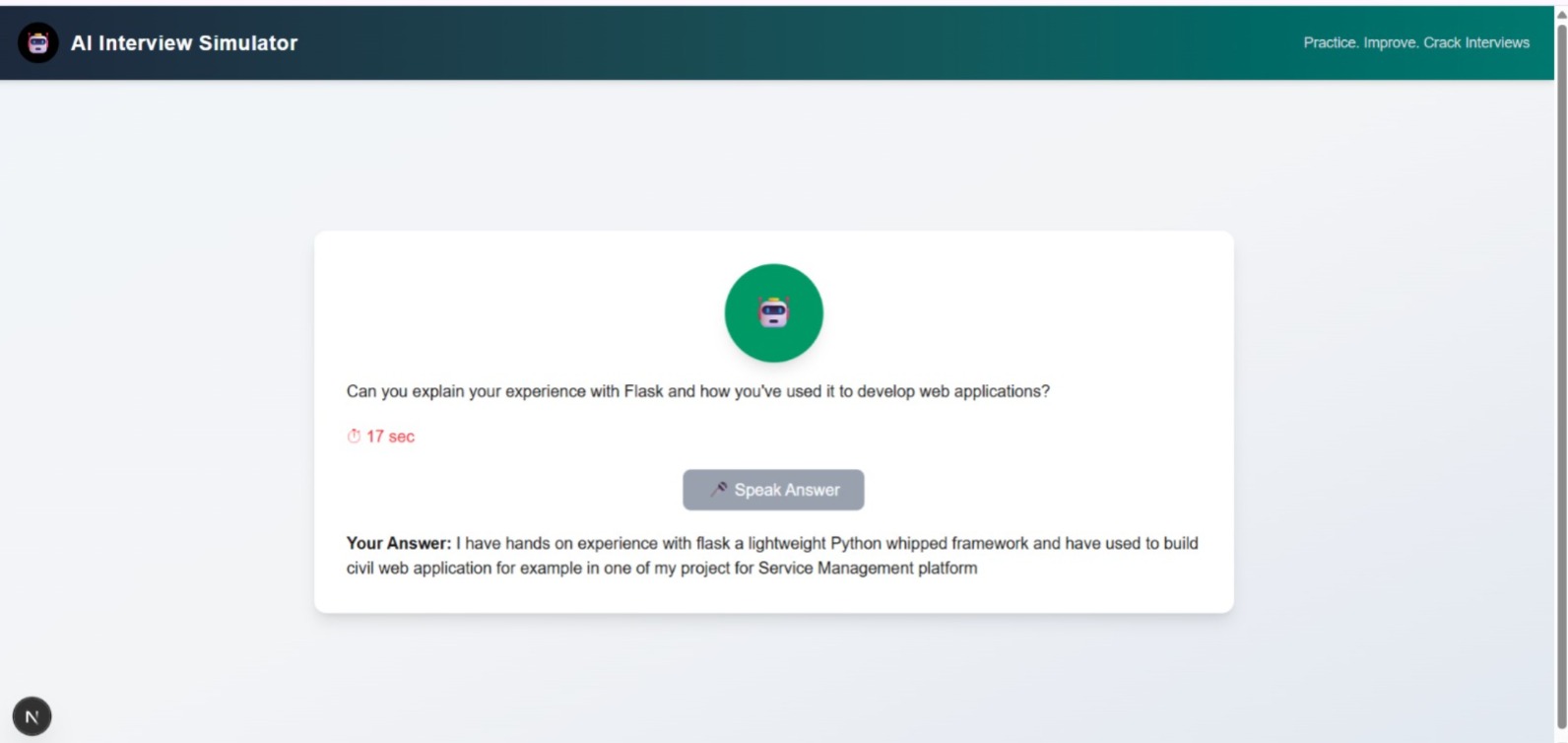 What's next for AI Interview Simulator Adding more question categories and custom difficulty levels. Incorporating advanced AI reasoning for deeper feedback on answers. Enhancing the speech interface for multilingual support. Building a performance tracking system for long-term improvement. Exploring mobile app deployment to make the simulator more accessible.