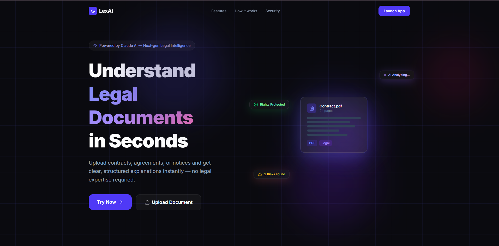 Built a system that makes legal documents understandable in seconds Successfully integrated document upload + AI analysis workflow Designed a clean, modern, and user-friendly interface Created structured outputs that actually help users take action Made a tool that has real-world impact for non-experts