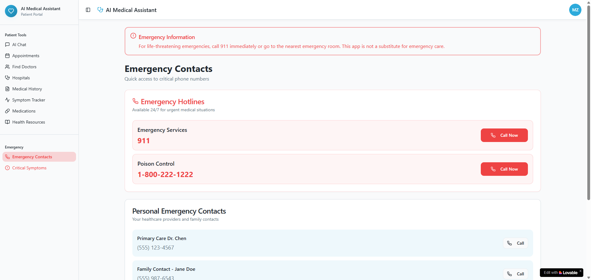 Symptom & History Tracking: Users can securely log and manage their chronic conditions, medications, allergies, and family history.