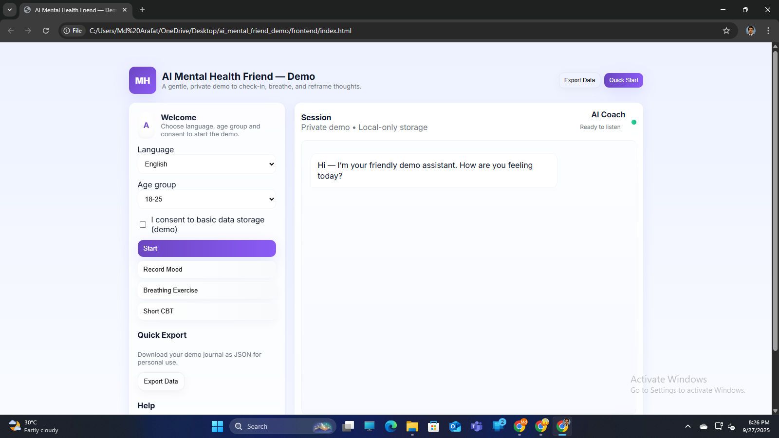- The project is designed as a safe, ethical demo of how AI can act as a supportive companion – not a substitute for professional help.